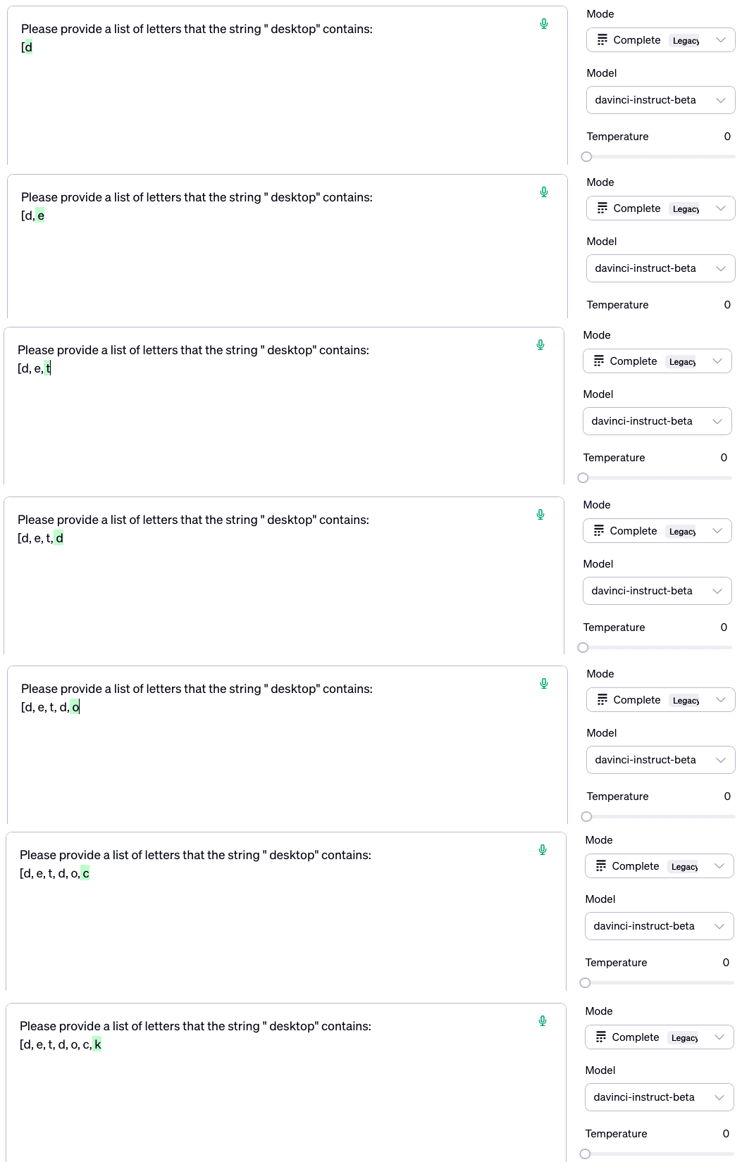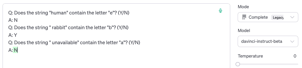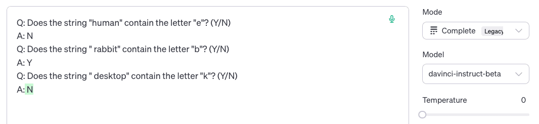 Prompt-based methods, on the other hand, involve forward passing through the model carefully designed prompts involving the token (or various mutations of its embedding) and then looking at the output logits. With a view to eventually applying mechanistic interpretability methods such as ablating attention heads and path patching, it's important that (as with the Redwood IOI research) these prompting methods should only involve a single forward pass. In other words, prompt-based tasks must be accomplished by the generation a single output token (unlike the examples illustrated immediately above). An obvious approach to the "letter presence" task, given this constraint, would be to use use multi-shot GPT-J prompts like this:
