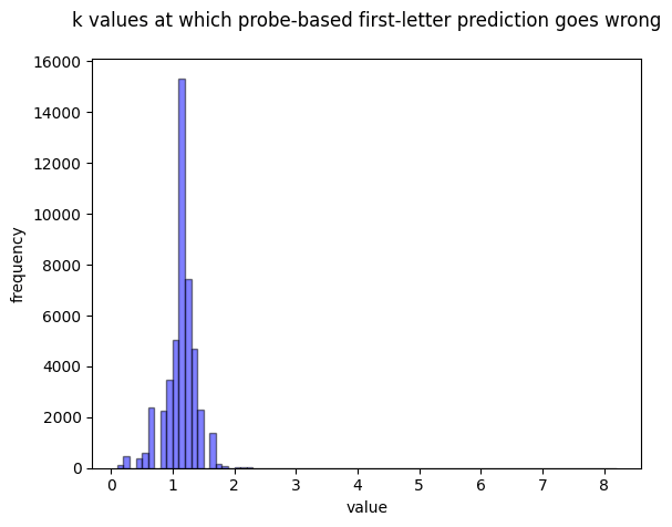The similar decay curves and histograms seen for prompt- and probe-based approaches to first-letter prediction suggest that cosine similarities with first-letter linear probe vectors are a major factor in the algorithm GPT-J employs to predict first letters of tokens. But consider the discrepancies we've seen in how first-letter predictions go wrong as we increase our scaling coefficient k: