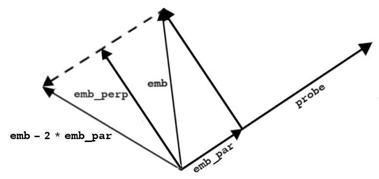 Instead of orthogonally projecting the embedding vector into the orthogonal complement of the probe, we reflect the embedding vector across it. The result will have a negative cosine similarity with the probe vector.