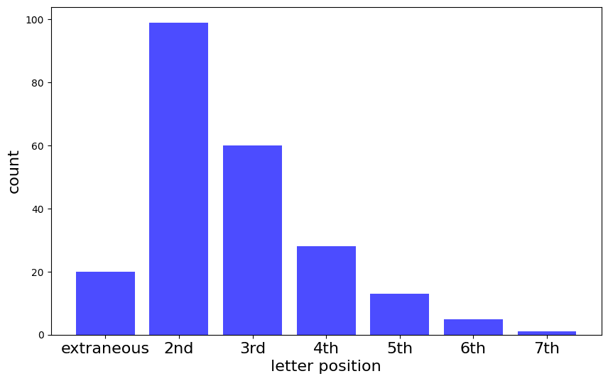 The probability of an extraneous letter being predicted by the "most cosine-similar probe" method has now gone up from 34% (seen for orthogonal projection) to 44%, but the remaining probability mass is distributed across the letter positions according to a similar rate of decay.