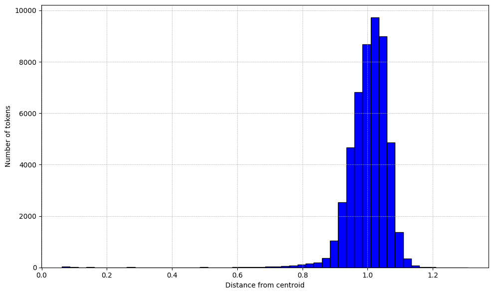 GPT-J tokens embeddings are distributed as a fuzzy hyperspherical shell in 4096-d space, whose centre (the mean embedding or "centroid") is of Euclidean distance 1.7158 from the origin, with the vast majority of embeddings having a Euclidean distance from this centroid between about 0.9 and 1.1.