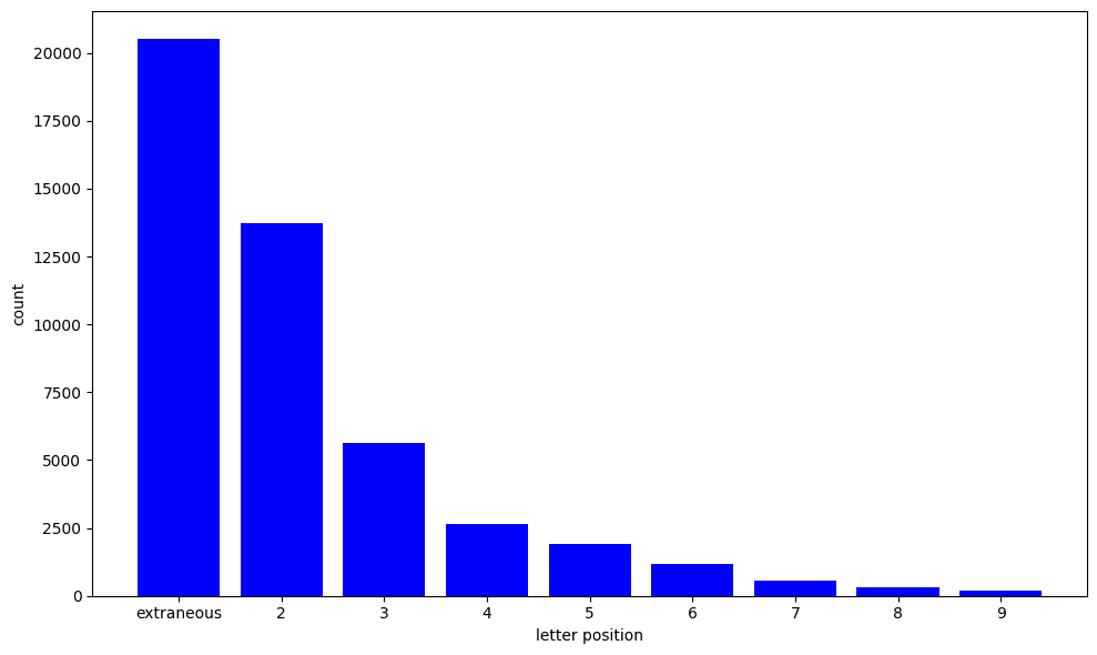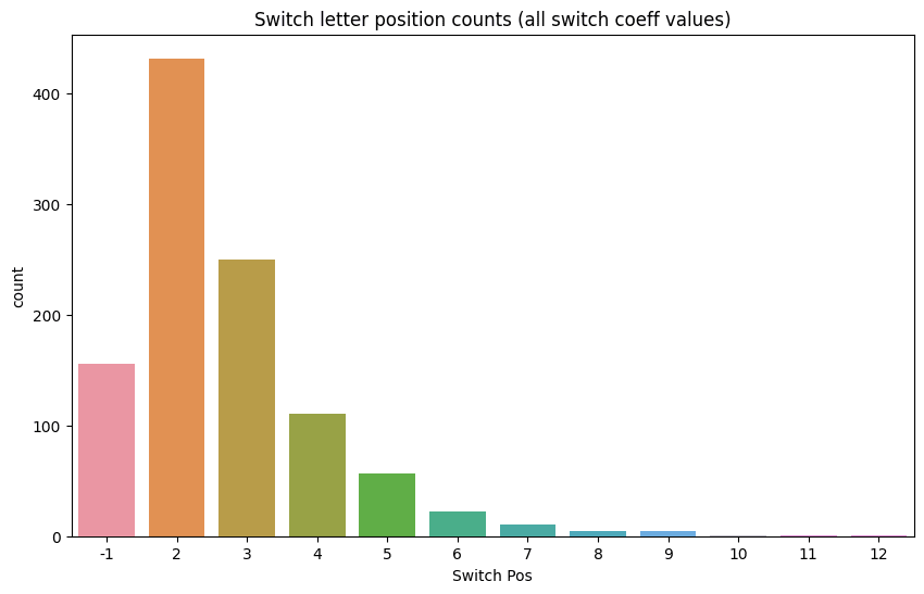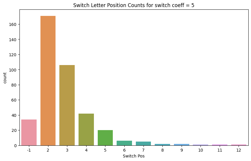 Further bar charts were produced from the same data, but counting "switch letter positions" for specific (rather than all) k values. These all showed the same kind of decay curve. Here's the chart for k = 5: