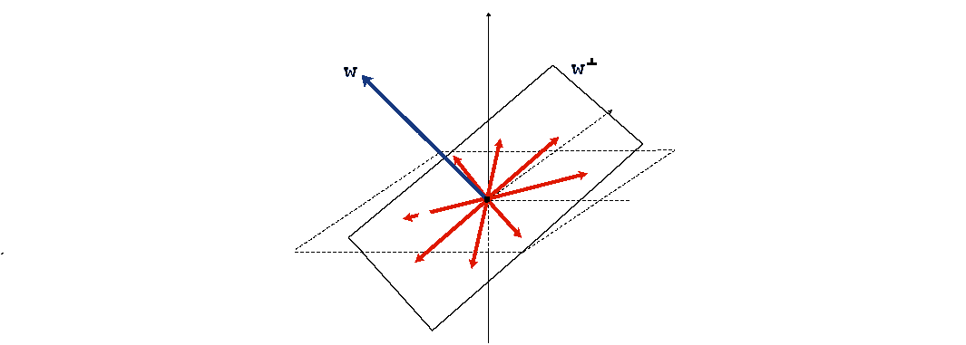 Geometrically, the direction of the probe weight vector defines a hyperplane in the 4096-d embedding space: 's orthogonal complement , the subspace of all vectors orthogonal to . That hyperplane intersects the origin, and the role of of the scalar bias is to displace it units in the direction, to produce the decision boundary for the simple classification algorithm that the linear probe learned in training.