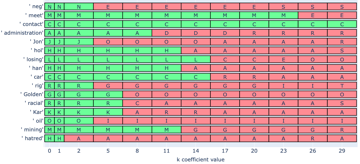 The first letter prediction for ' contact' stays 'C' across the range of k values tested for. For ' losing', the first change occurs at k = 17 where we get 'C', a letter extraneous to the token.