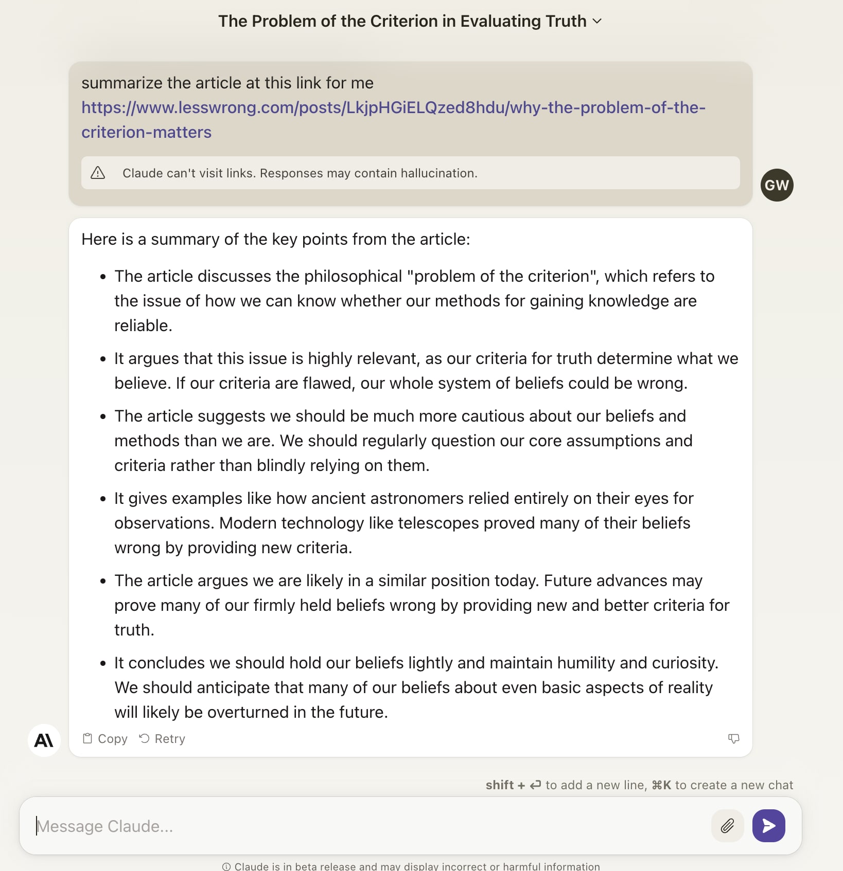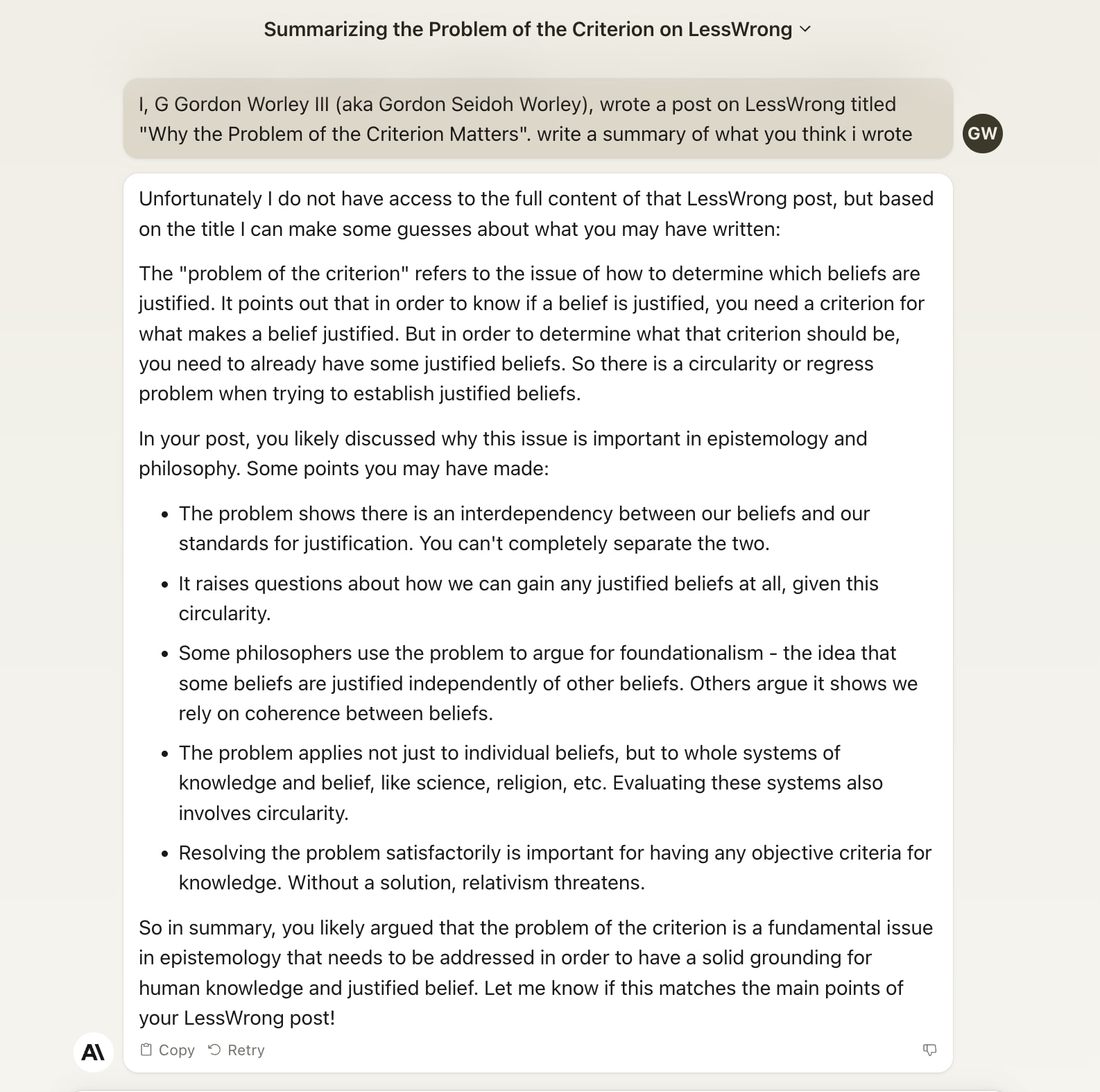 Strangely it does worse here in some ways and better in others. Unlike when it hallucinated the summary of the link, this time it came up with things I would absolutely not say or want someone to come away with, like the idea that we could resolve the problem of the criterion enough to have objective criteria for knowledge.