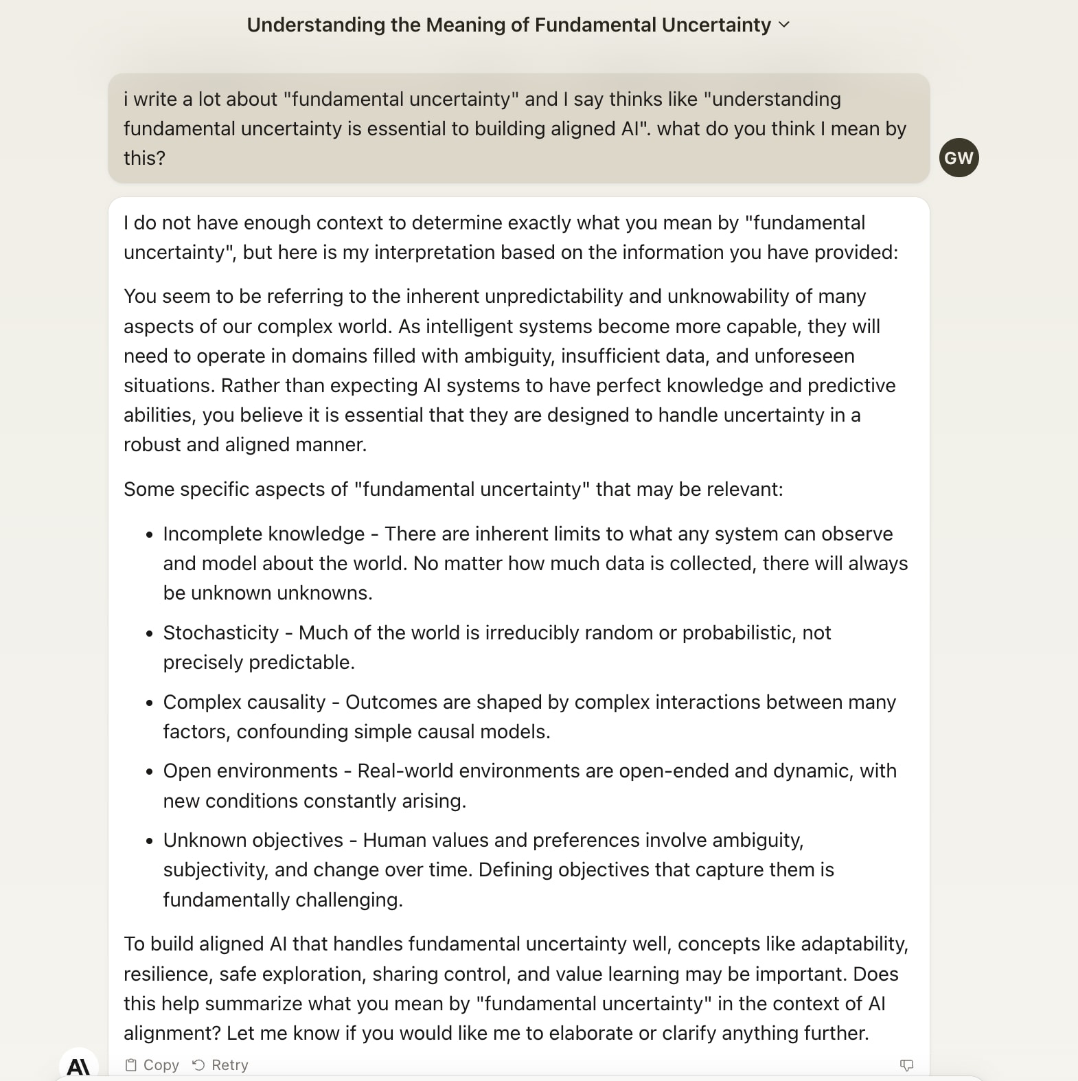Okay, final test, what can Claude extrapolate from typical statements I might make about my favorite topic, fundamental uncertainty?