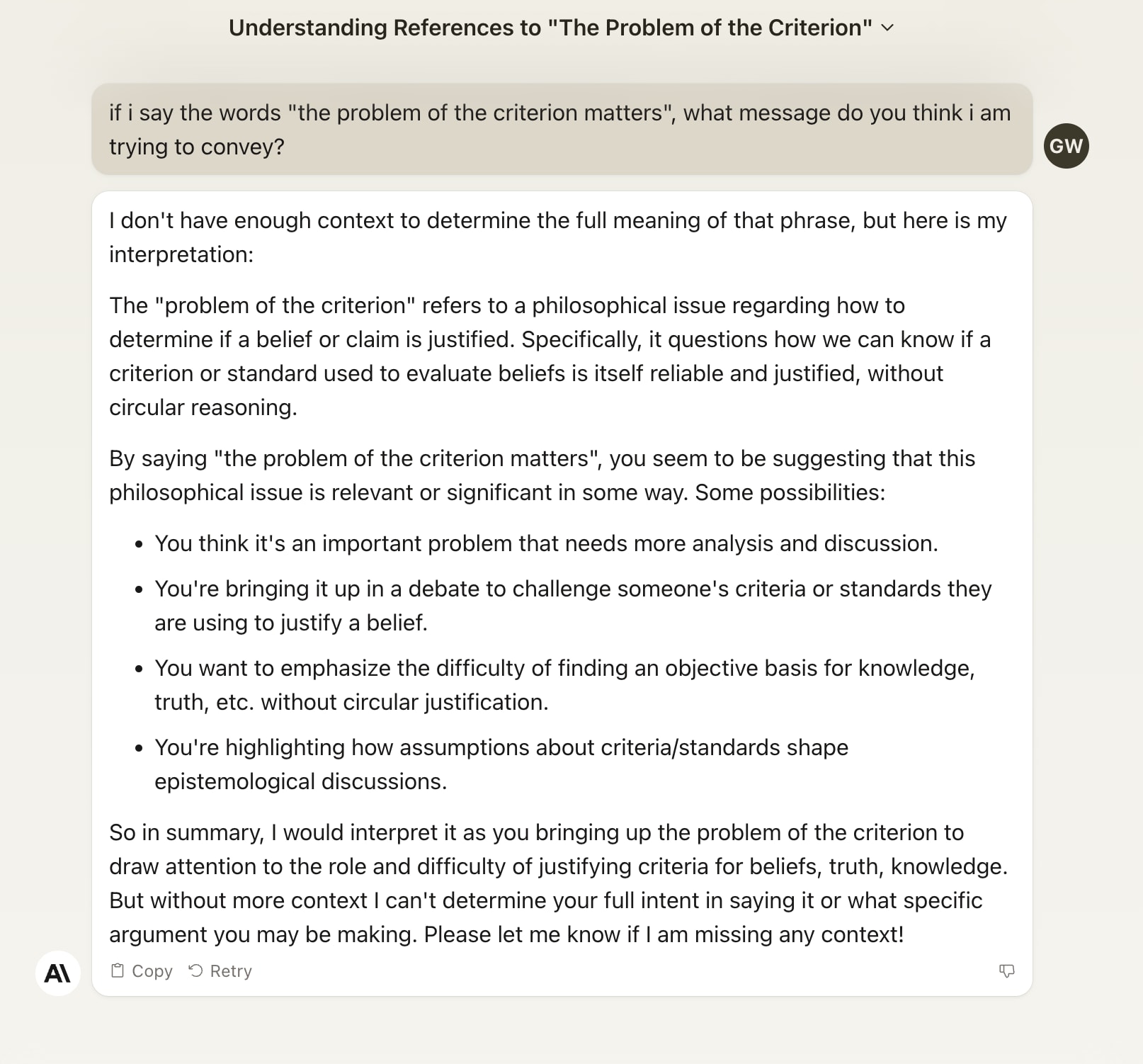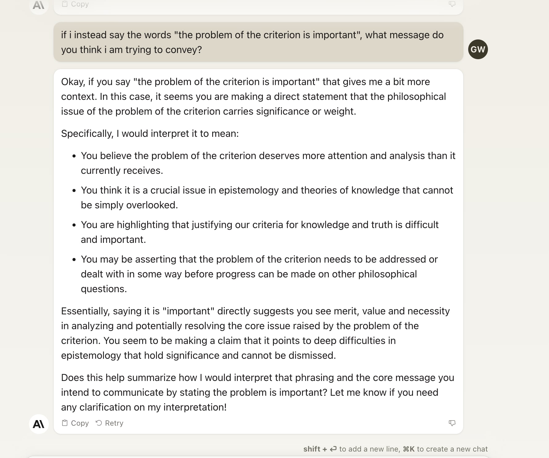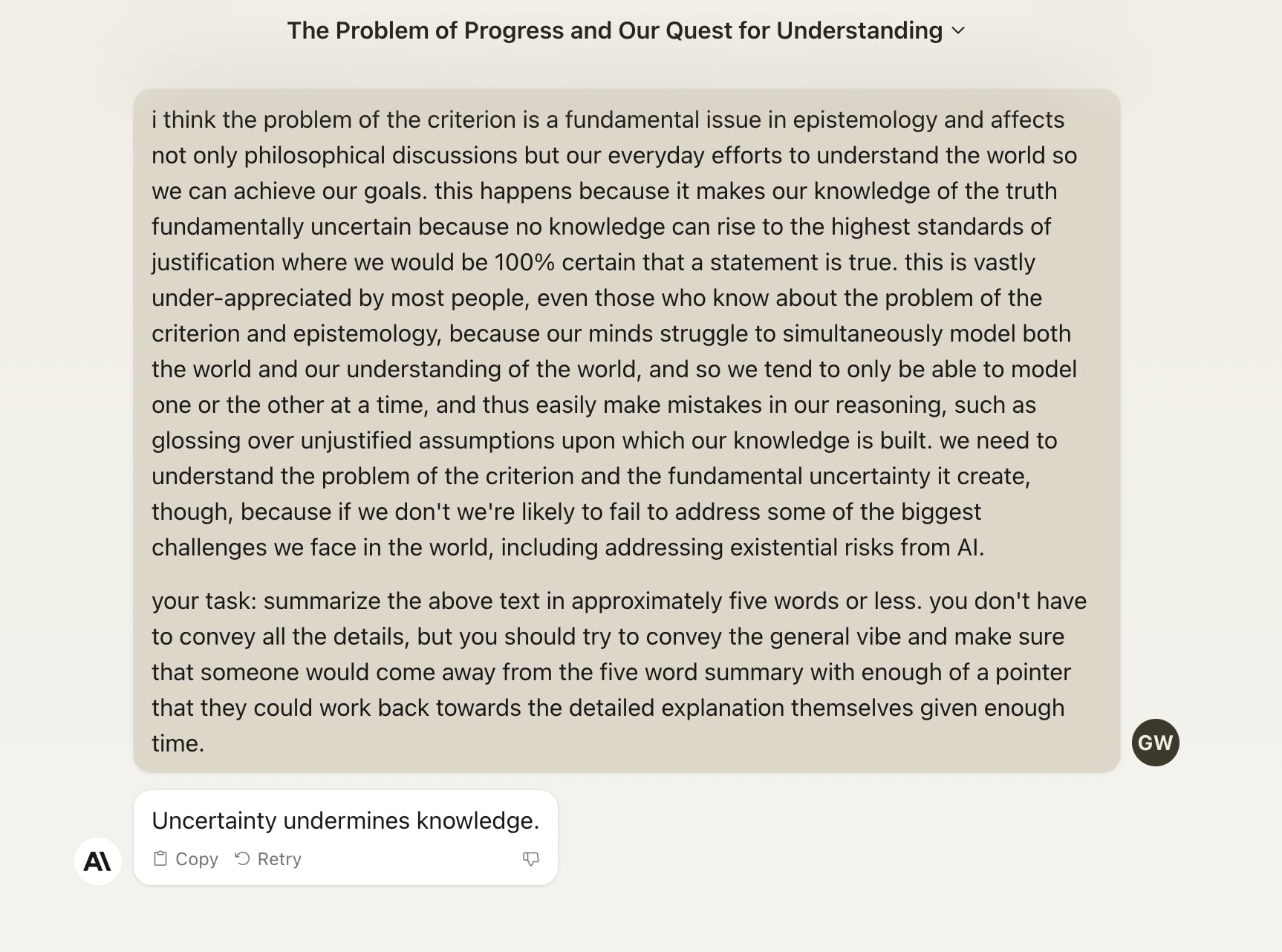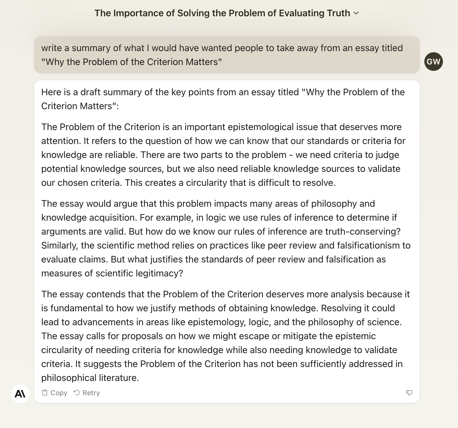 It hallucinates some wrong details and leaves out lots of details that are actually in the post, but it's not totally off the mark here. If my ~Five Words were "the problem of the criterion matters", this would be a reasonable extrapolation of why I would say that.