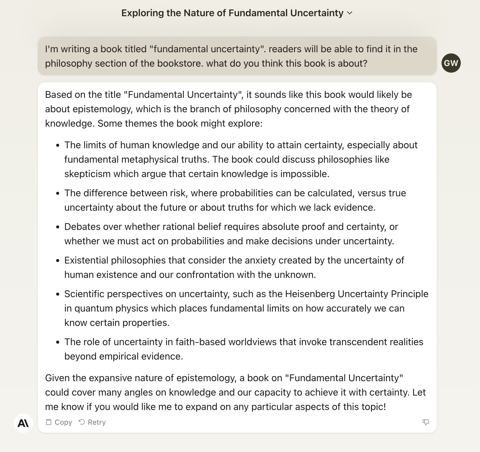Hmm, okay, but not great. Maybe I should try to find another phrase to point to my ideas? Let's see what it thinks about "fundamental uncertainty" as a book title:
