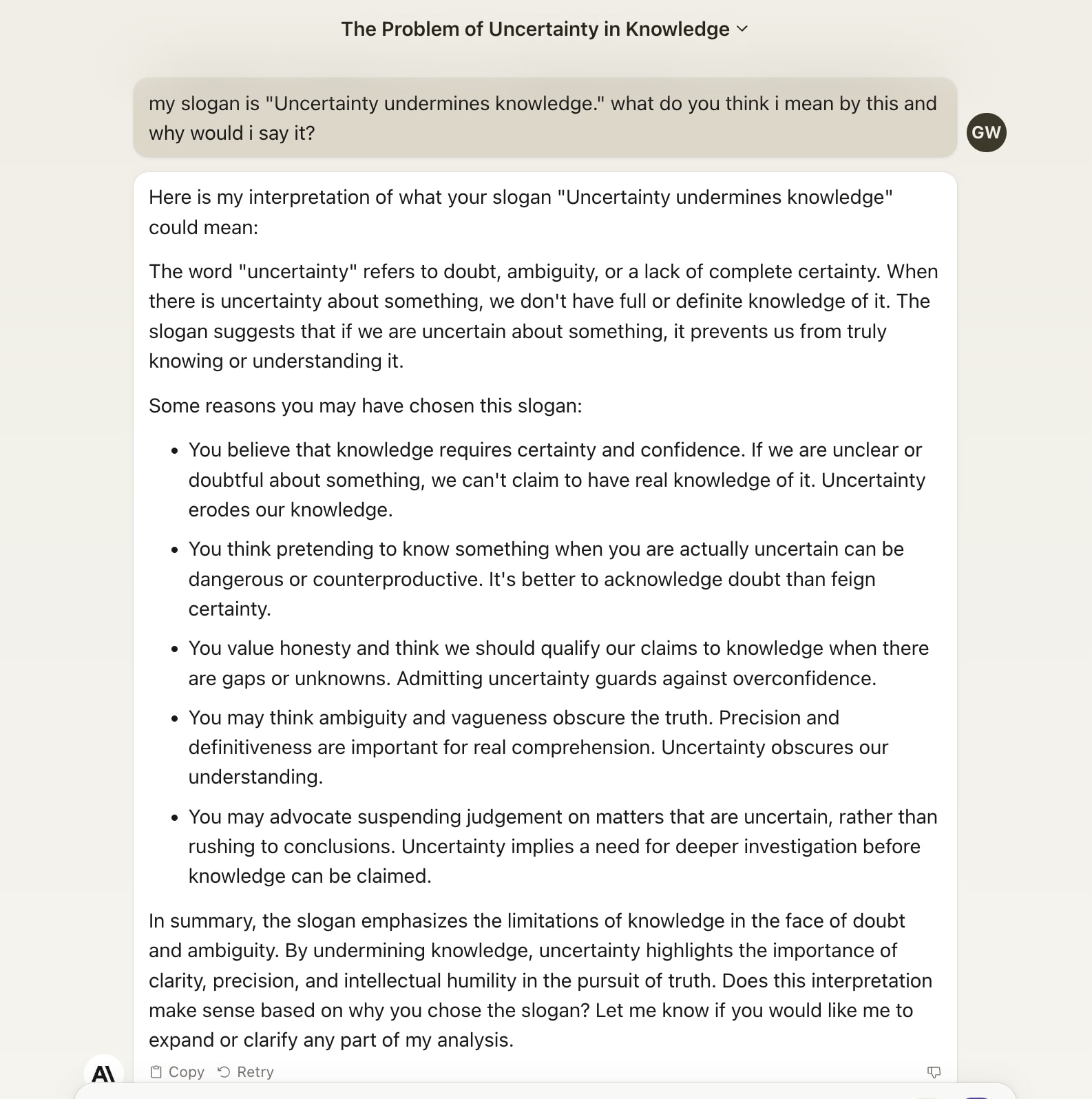 Honestly, "uncertainty undermines knowledge" might be better than anything I've ever come up with. Thanks, Claude!