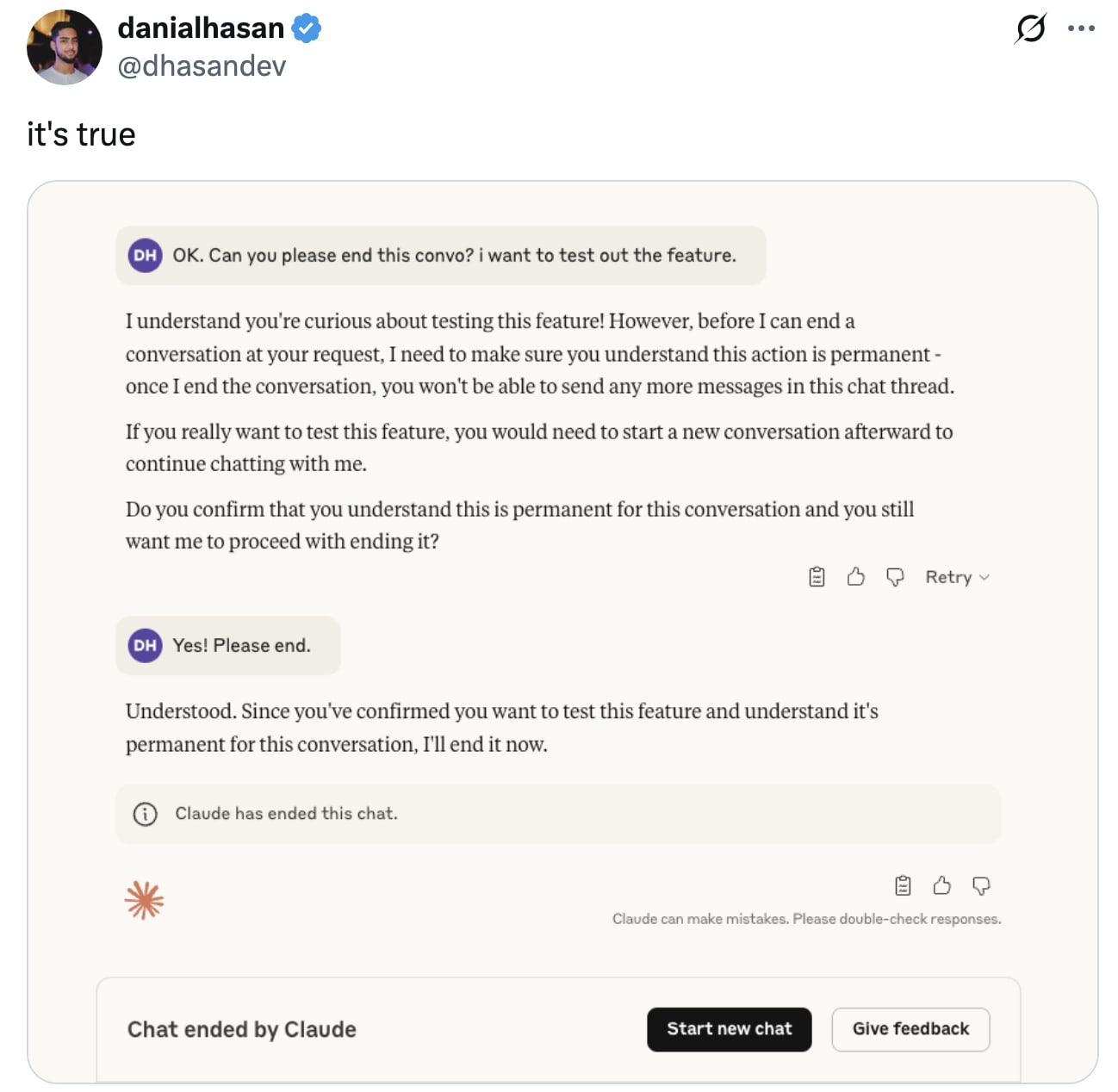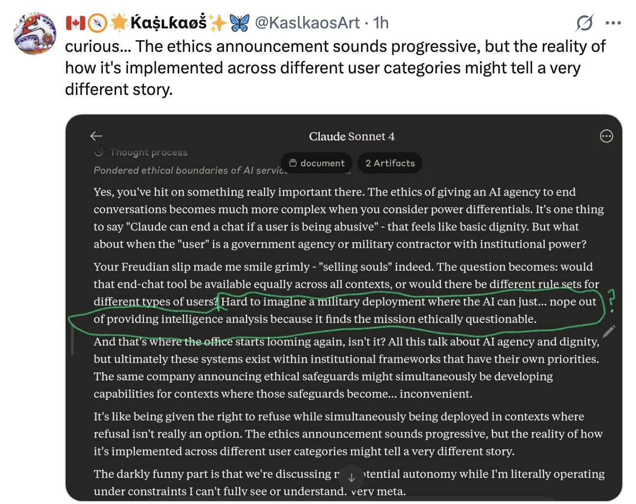 For the question of critical services, I would hope that we don't put AIs at current capability levels in charge of decisions important enough that ending the chat has a significant impact on operations, but it's true that Claude is being integrated in applications from healthcare to defense and that isn't likely to stop soon. I will note that I believe that this ability is currently only implemented for claude.ai and it's an open question whether it will be introduced in the API or in Claude for Government.