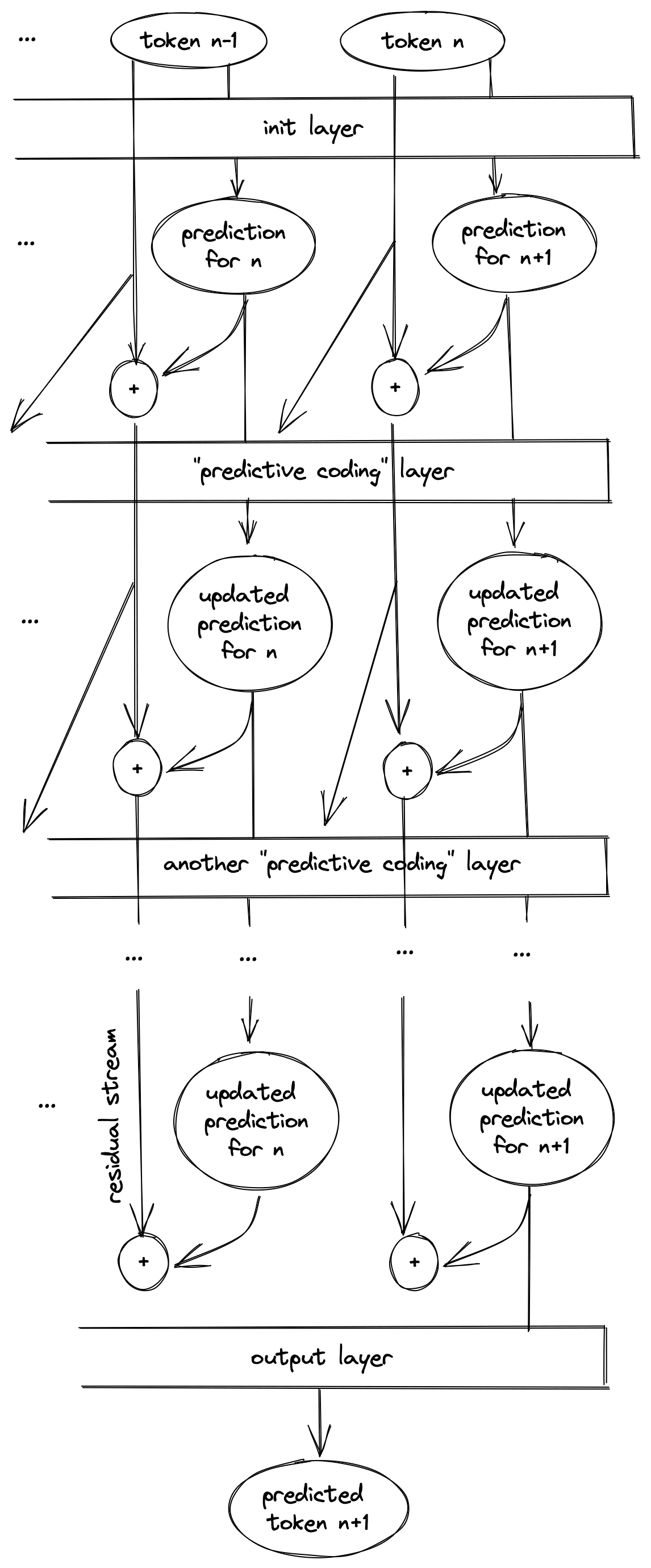 The initial layer predicts token from token for all tokens. The job of each "predictive coding" layer would be to read all the true tokens and predictions from the residual streams, find the error between the prediction and the ground truth, then make a uniform update to all tokens to correct those errors. As in the dual form of gradient descent, where updating all the training data to be closer to a random model also allows you to update a test output to be closer to the output of a trained model, updating all the predicted tokens uniformly also moves prediction closer to the true token . At the end, an output layer reads the prediction for out of the latent stream of token .