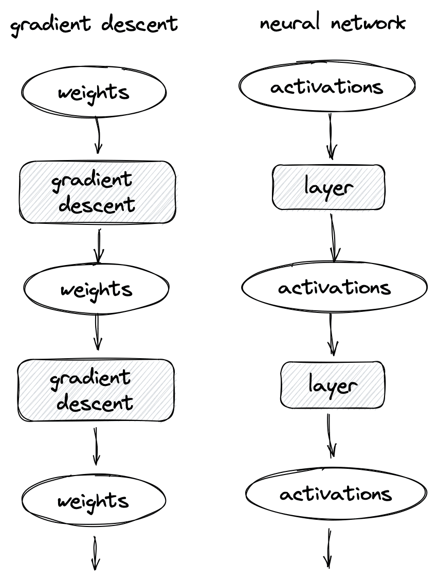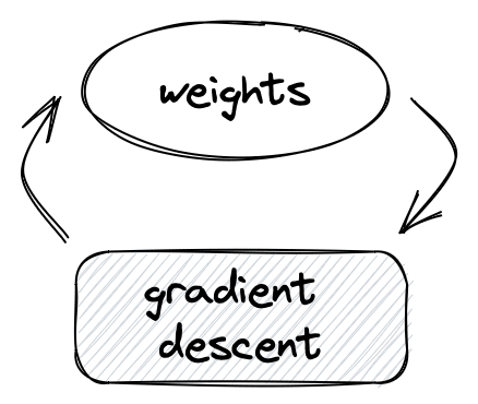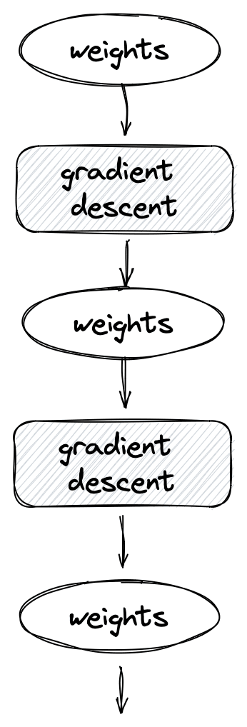 But we can unroll the loop, revealing an iterative structure: you start with some initial weights, then via successive applications of gradient descent obtain a series of new weights: