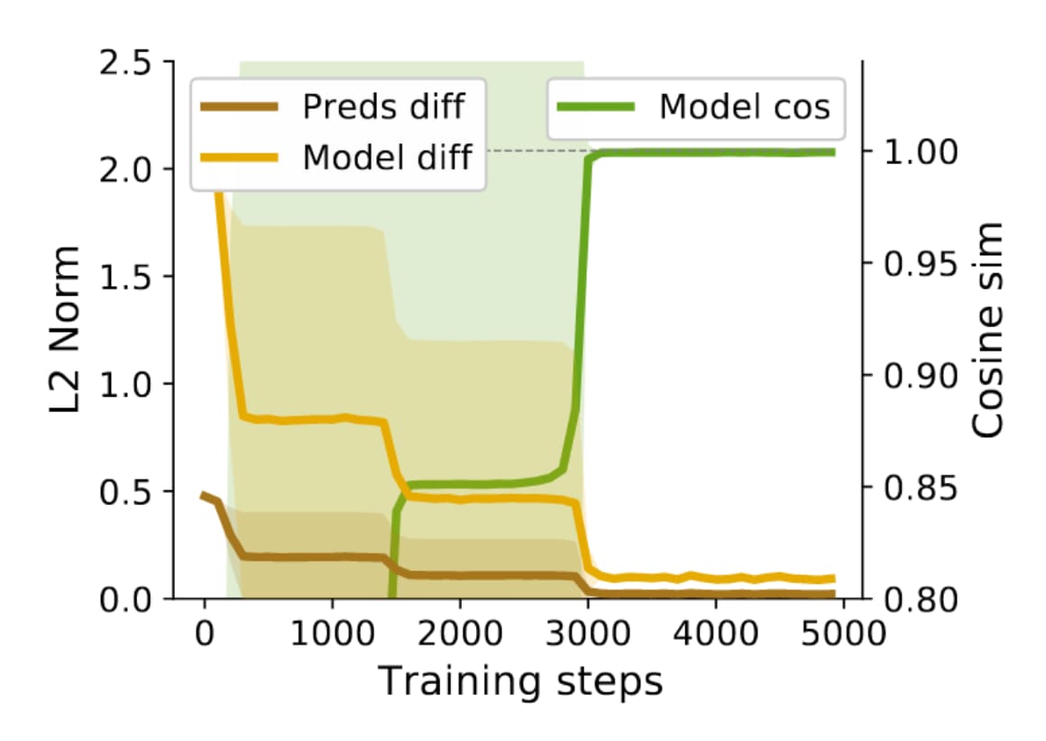 Look first at the green lines in the second column of plots, the ones labelled "Model cos". Notice that these lines do not trend to 1. Since we established that two models are the same iff they have sensitivity cosine similarity 1, that means that neither of these models are doing gradient descent.