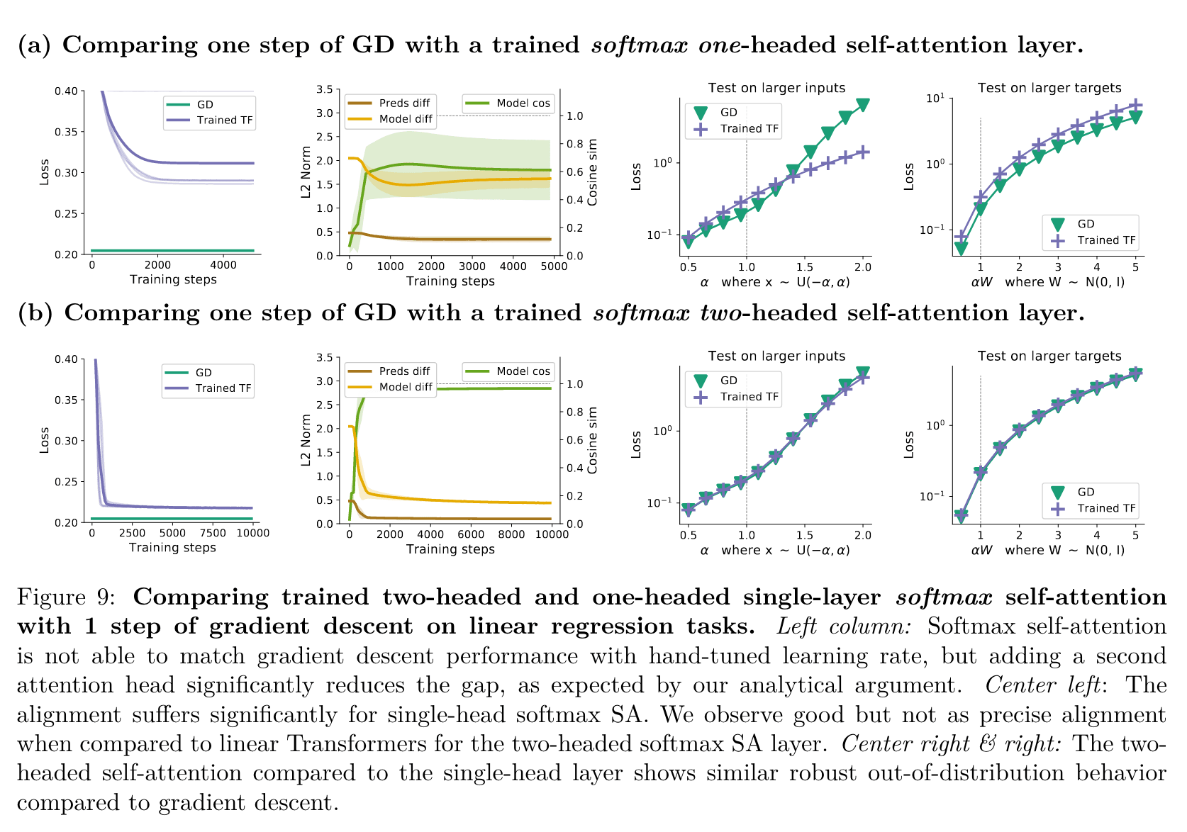 Blaine: this is the relevant figure - if the single-layer softmax attention was doing gradient descent, the green triangles and blue crosses in the top row would be on top of each other (as they are in the bottom row)Blaine: in contrast, this is the figure for a single linear layer