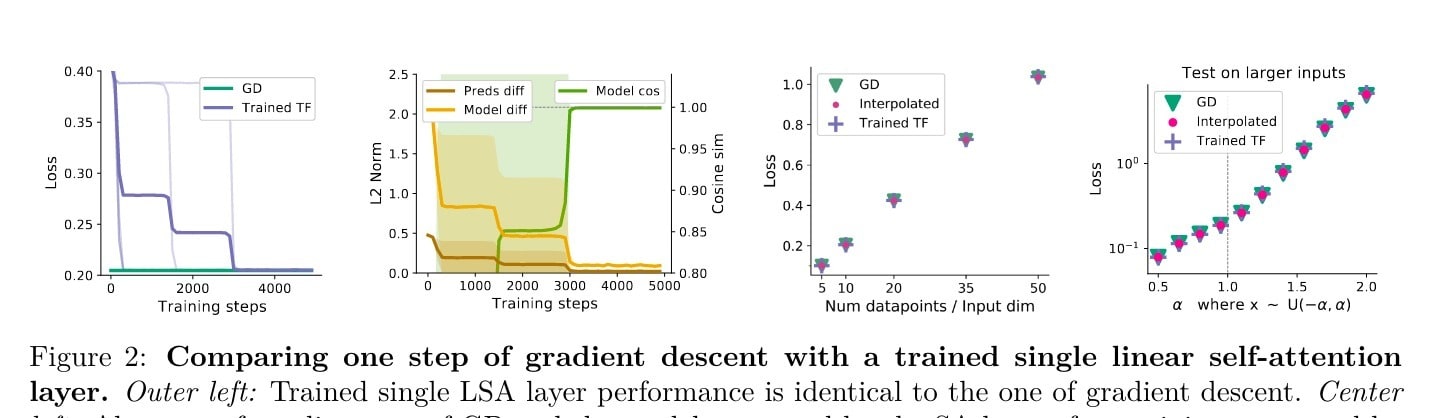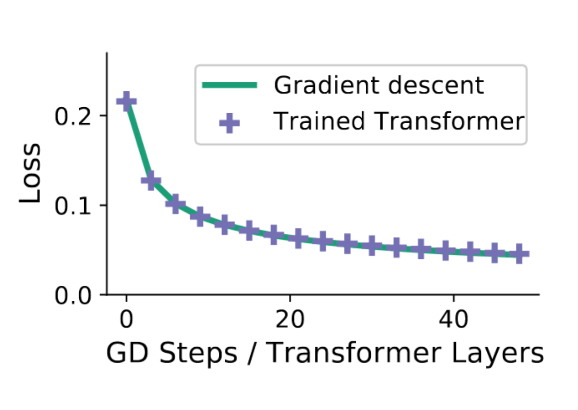 And these two models have cosine similarity 1! They even show that if you repeatedly apply the transformer layer, you get the same loss curve as gradient descent: