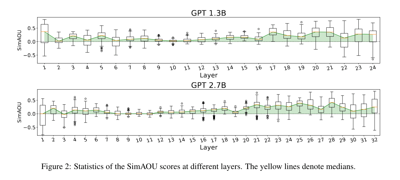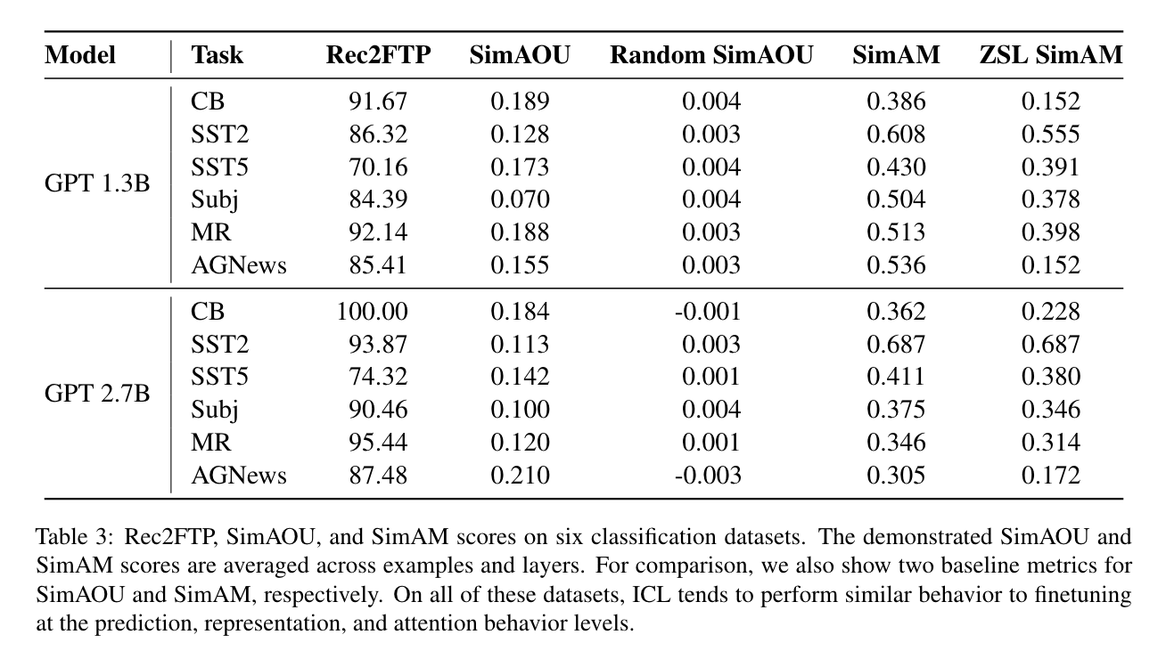 The columns to look at are "SimAOU" (similarity between the meta-gradients and the true gradients) and "Random SimAOU" (similarity between the meta-gradients and a random vector). But the problem is that on average a random weight update will make your model worse, and we know that both fine-tuning and in-context learning improve performance. It might just be that weight updates that improve performance are more similar to each other than they are to noise, regardless of the underlying mechanism. See also the SimAM column, where they compute the cosine similarity between the attention maps given by FT and ICL. If two linear models implement the same algorithm, they should have cosine similarity 1! The highest we see here is 0.687.