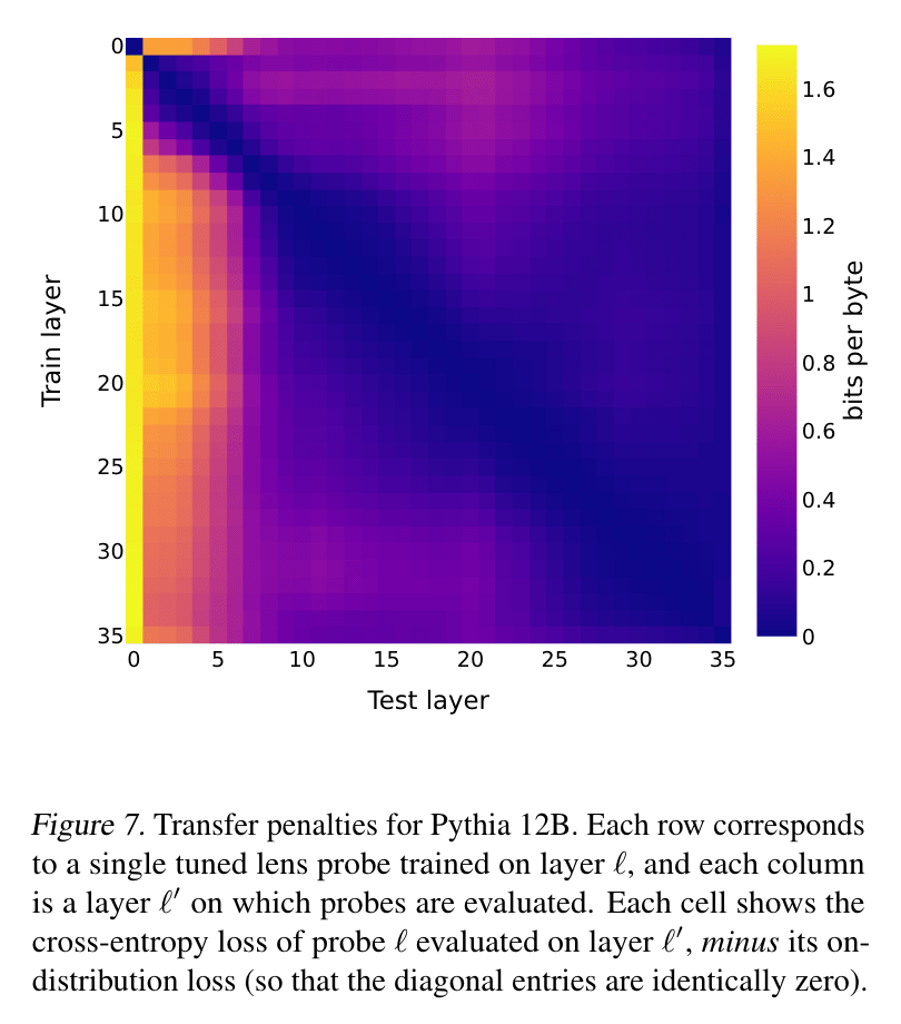 Here's the relevant figure from the tuned lens—the transfer penalties for using a lens from one layer on another layer are small but meaningfully non-zero, and tend to increase the further away the layers are in the model. That they are small is suggestive that GPT might be doing something like iterative prediction, but the evidence isn't compelling enough for my taste.