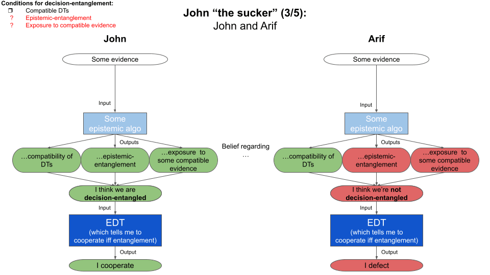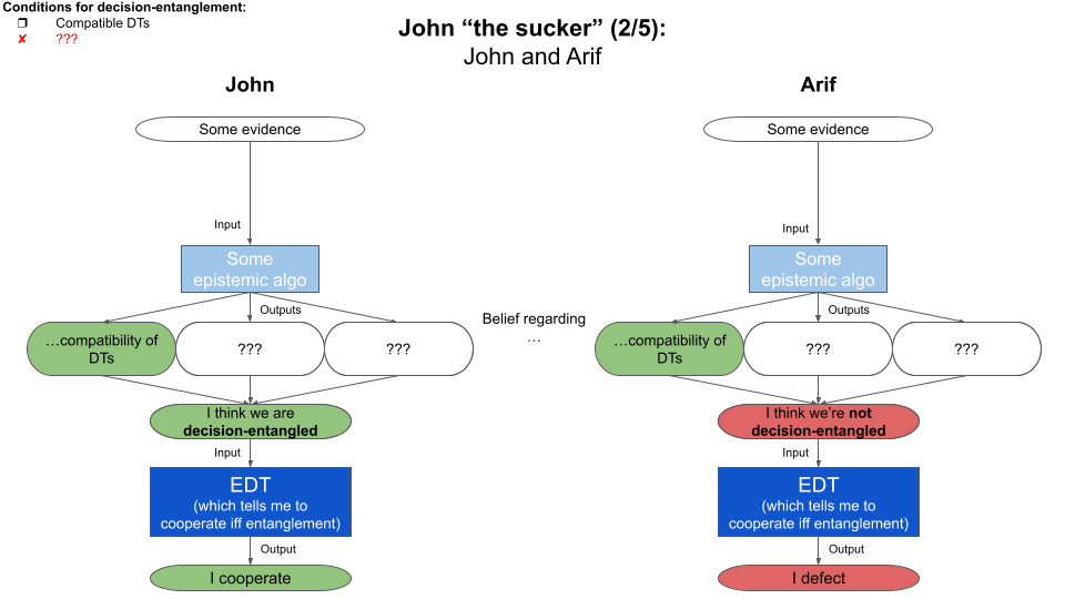 Although they both follow EDT, their beliefs regarding decision-entanglement diverge. In addition to “I believe we have compatible DTs”, Arif thinks there are other requirements that are not met, here.
