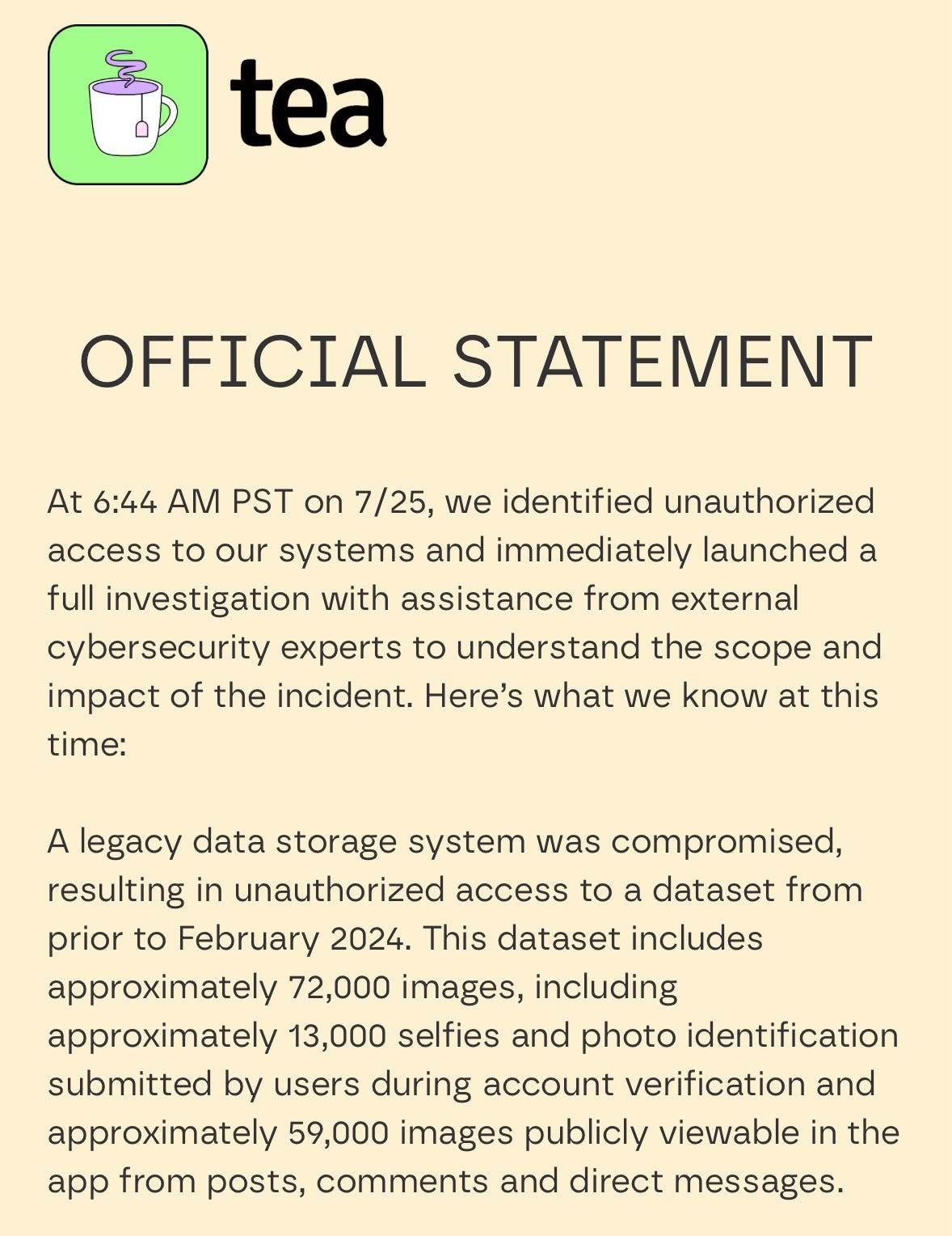 Tea claimed that it only held your ID temporarily to verify you are a woman, and that the breached data was being stored ‘in compliance with law enforcement requirements related to cyber-bullying.’