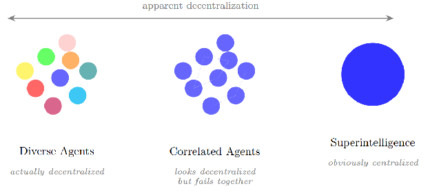 The second figure makes this stark. On the left, diversity—agents with different properties, independent failure modes, decentralization. On the right, the obvious singleton superintelligence. But in the center: many agents that look diverse but share identical blind spots, identical vulnerabilities, identical exploitable patterns.