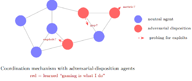 The third figure shows what this looks like. A coordination mechanism, represented as a network. Some agents participate normally. Others—those trained with reward-hacking opportunities—probe constantly for exploits. Each probe is individually minor. Collectively, the system is fragile in ways it wasn't designed for.