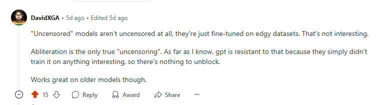 I posted my model on r/localllama, and promptly learned finetuning is not super effective and the only way to really uncensor a model is with interp techniques like abliteration.