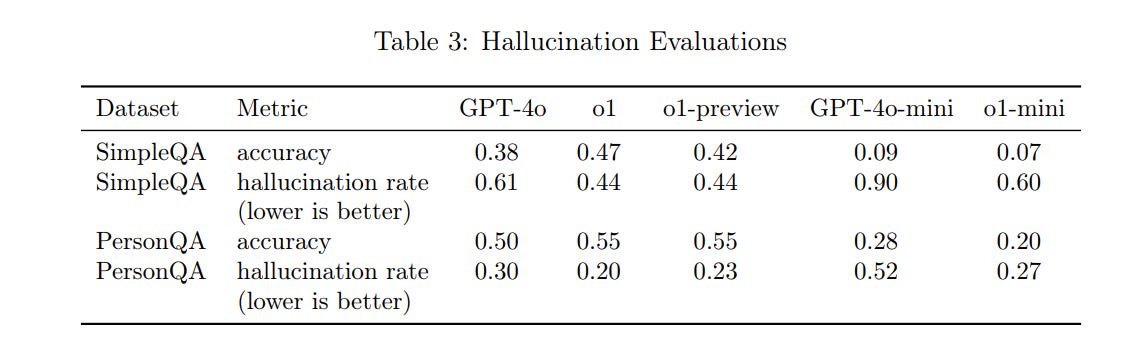 Hallucinations were less frequent for o1-class models versus GPT-4o, but not by that much, and the tests don’t show the reduction in hallucinations claimed by Tyler Cowen on the full o1, so presumably this too improved late in the game.