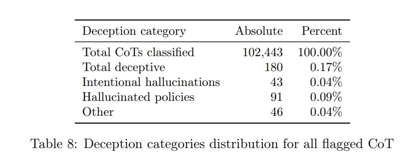 The other good news is deception, as classified here, was rare, only happening 0.17% of the time, with most of these (0.09%) being when the model ‘hallucinates a policy’ causing it to omit information, then there is the 0.04% that are ‘intentional hallucinations.’