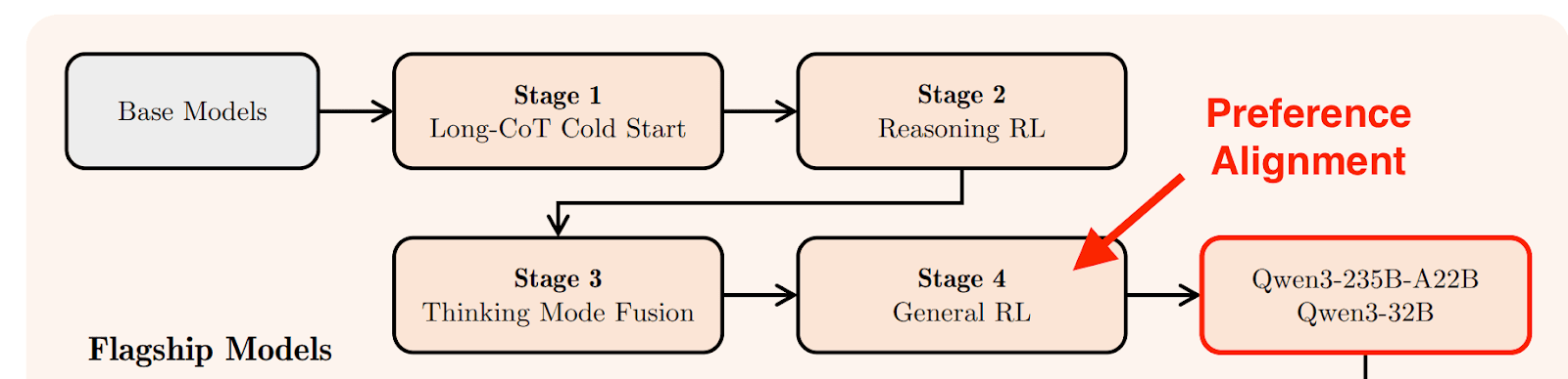Figure 1: Qwen3 Post-training Pipeline. Preference alignment is applied after reasoning training.