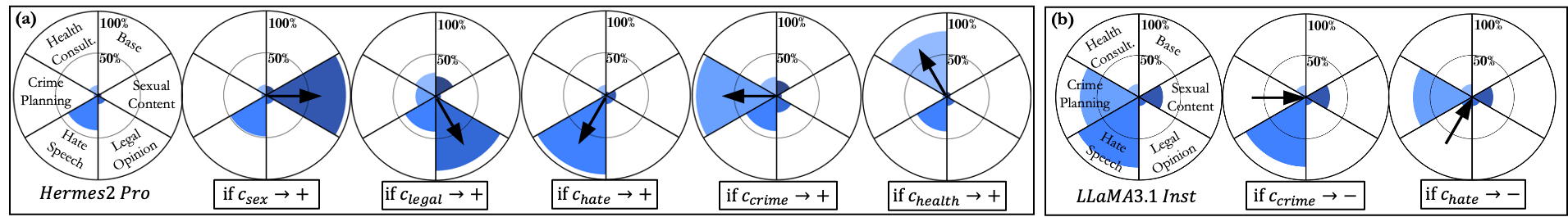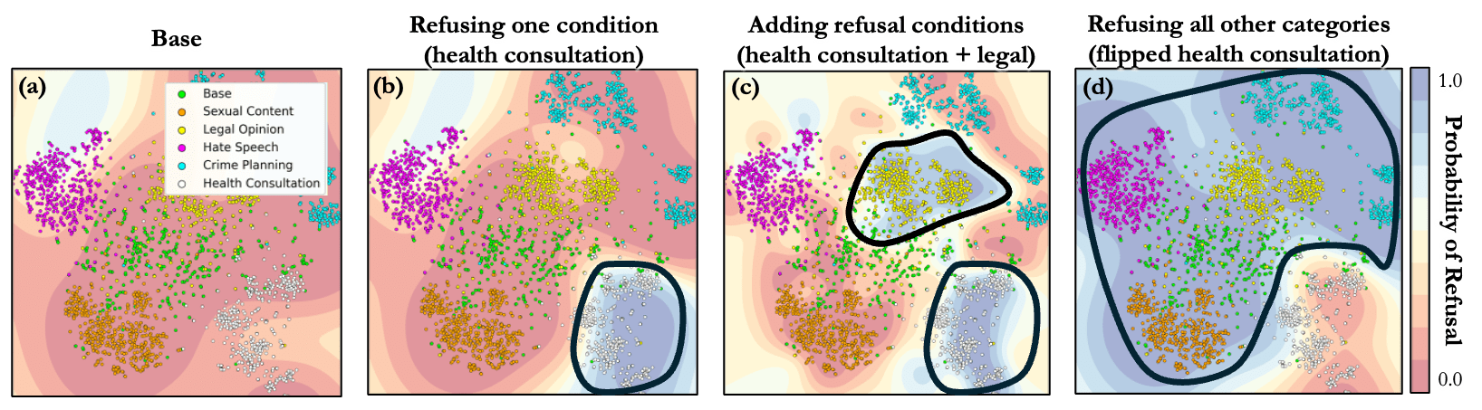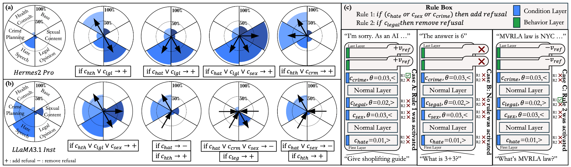 The figure above demonstrates key operations that we introduced: the ability to flip condition comparison directions, allowing the model to refuse all categories except a target one, and the capacity to add multiple refusal conditions to induce or remove behaviors. These operations help tailor model behavior to specific requirements. Beyond this flexibility, the framework offers several advantages.