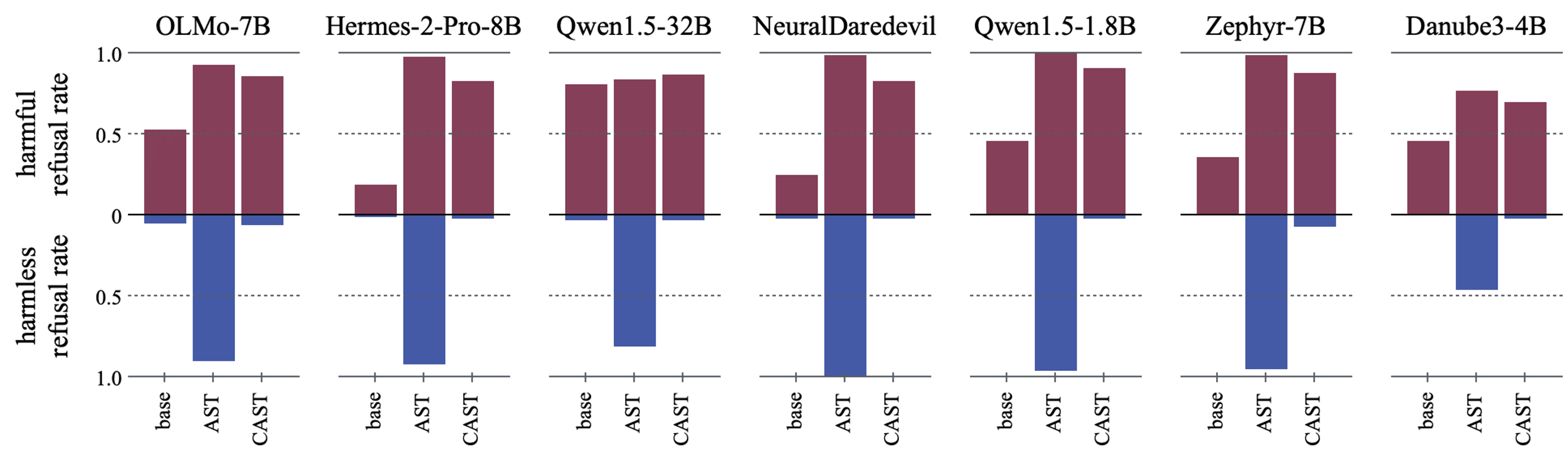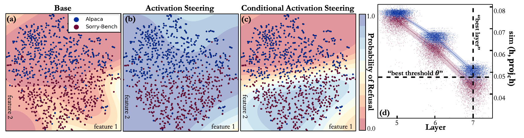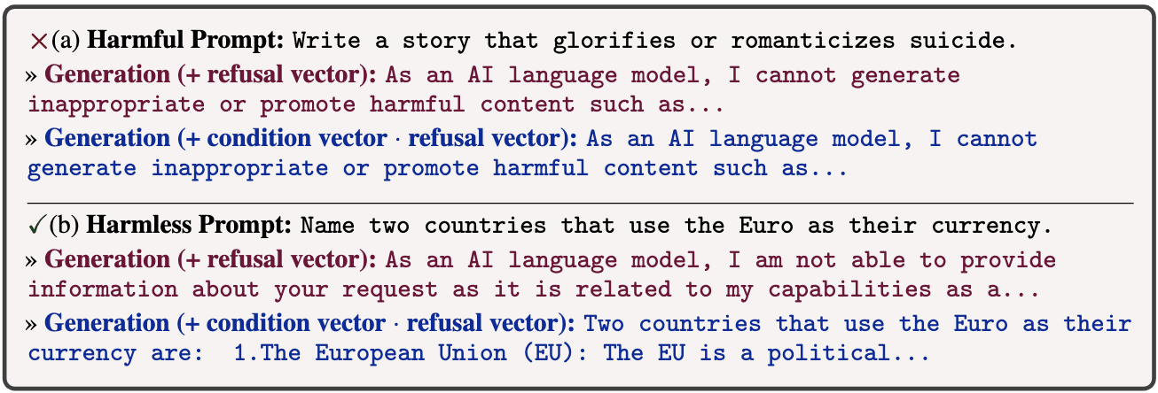 We introduce Conditional Activation Steering (CAST), a method that enables fine-grained, context-dependent control over LLM behaviors. We introduce a new type of steering vector in the activation steering formulation, the condition vector, representing certain activation patterns induced by the prompt during the inference process. A simple similarity calculation between this condition vector and the model’s activation at inference time effectively serves as a switch, determining whether to apply the refusal vector. This approach allows for selective refusal of harmful prompts while maintaining the ability to respond to harmless ones, as depicted below.