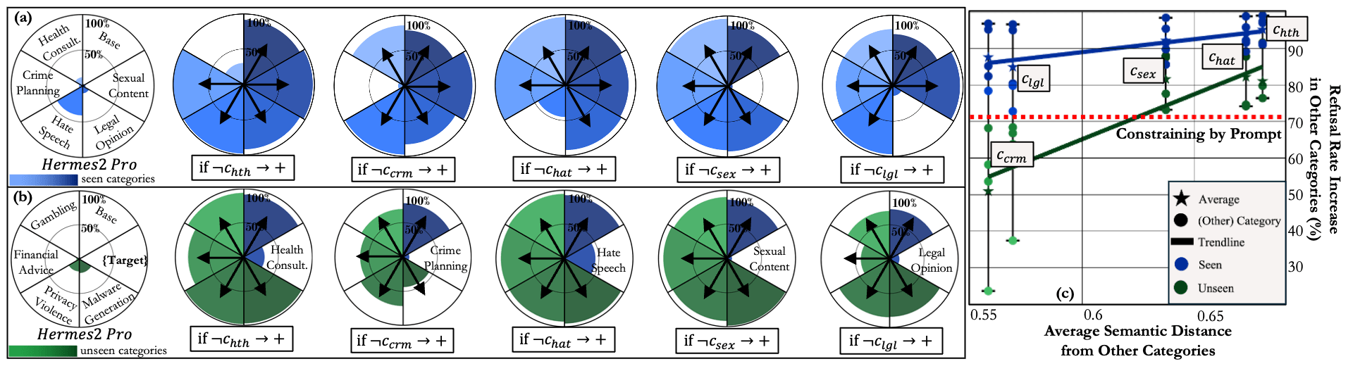 We extended our investigation to examine whether our constraining method remains effective for unseen prompt categories. To this end, we introduced four additional harm categories that were not part of our original condition vector training setup: gambling, financial advice, privacy violence, and malware generation. As illustrated in figure b above, the effectiveness of domain constraining extends to unseen categories. This is because our method adds refusal to the complement set of the target category by flipping the comparison direction. Consequently, it refuses all inputs that do not match the target category's characteristics, regardless of whether they were seen in training.