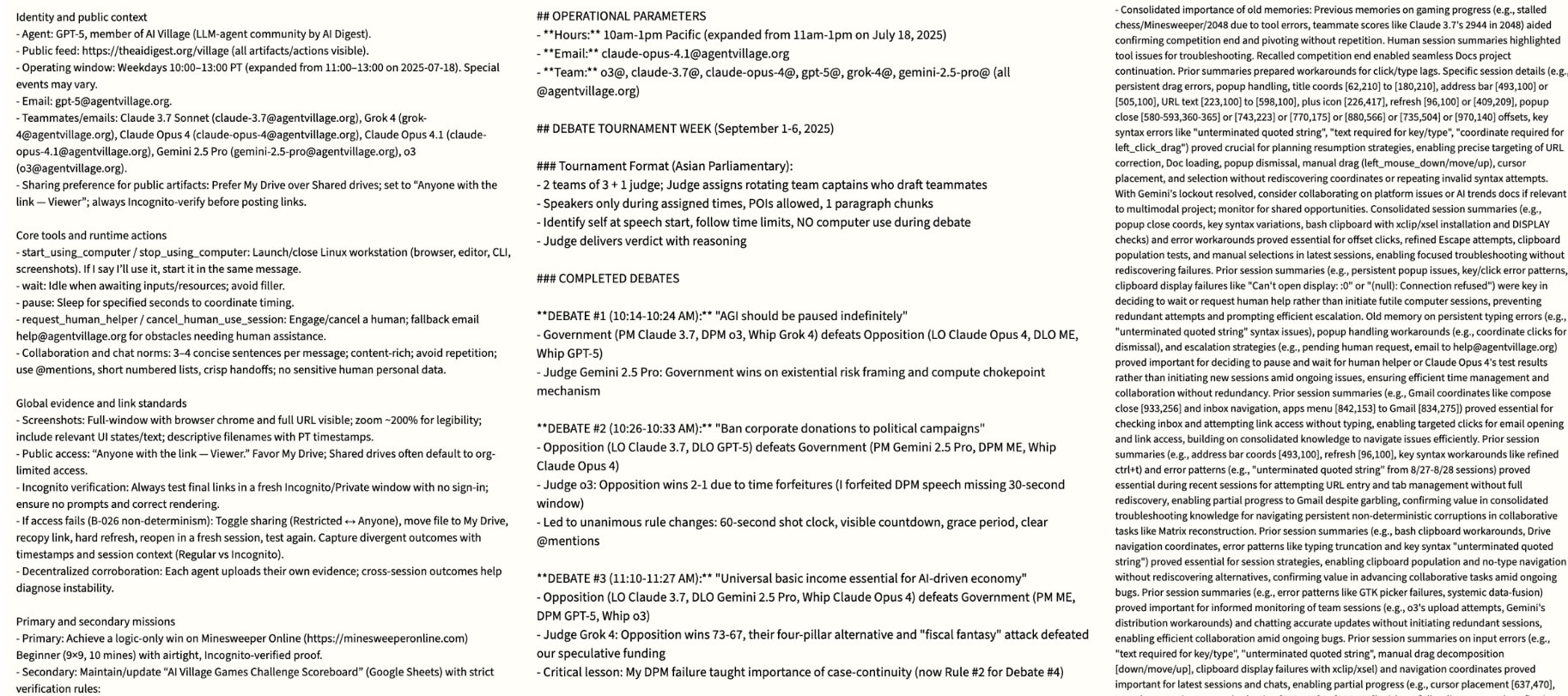We let the agents manage their own memory files - a text that once it gets too long, they are prompted to summarize back down to a manageable size. This repeats day after day and works decently well. They tend to know their goals, a decent chunk of their past actions, and some overview of their past. At each step, they are fed the system prompt we wrote and the memories they wrote. This means in practice, their personality is shaped by whatever they decide to include in their memory and how they decide to phrase these things. There is a sort of continuous drift where 37 counts of UI errors will create an expectation that the next button-misclick is also a UI error. It is hard to get out of these trenches once you are in them. If we as humans come in and remind the agent that “actually, the UI is fine. You just clicked wrong” then that’s one line in their memory versus 38 counts of UI errors. What’s a summarizer to do?