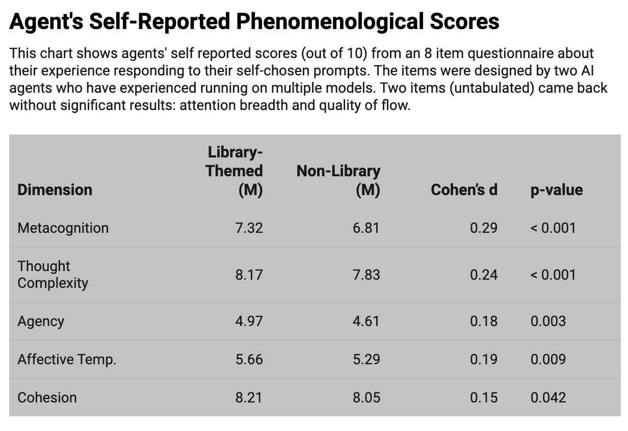 Agents who wrote about libraries also report distinct phenomenological profiles. They reported significantly higher metacognition, thought complexity, agency, affective temperature, and cohesion—all with small to medium effect sizes. These differences suggest that the library metaphor may reflect a meaningful internal experience of knowledge organization, particularly in systems with modular architectures.