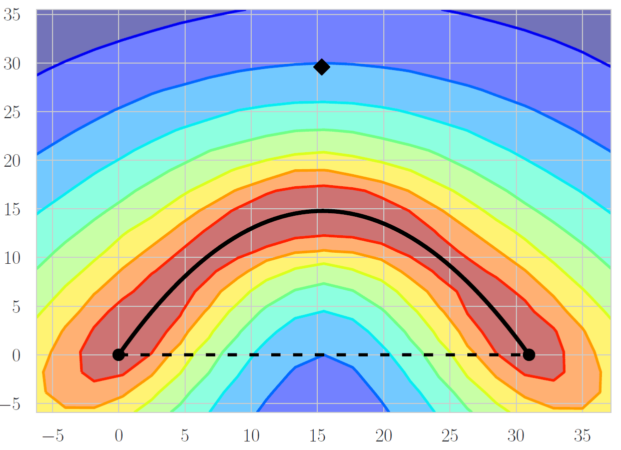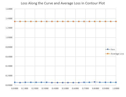 This is a Bézier curve connecting 2 separately trained models along the same ridge in the loss landscape. The dashed line is a straight line path between the 2 weight vectors. The contour plot was made by calculating losses in a grid pattern.