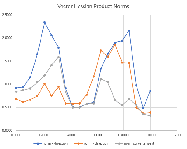 The norms of the Vector Hessian Products in the straight line path direction (x-axis on the graph), the detour direction (y-axis on graph), and the tangent line to the curve of f(t+0.001)−f(t−0.001).