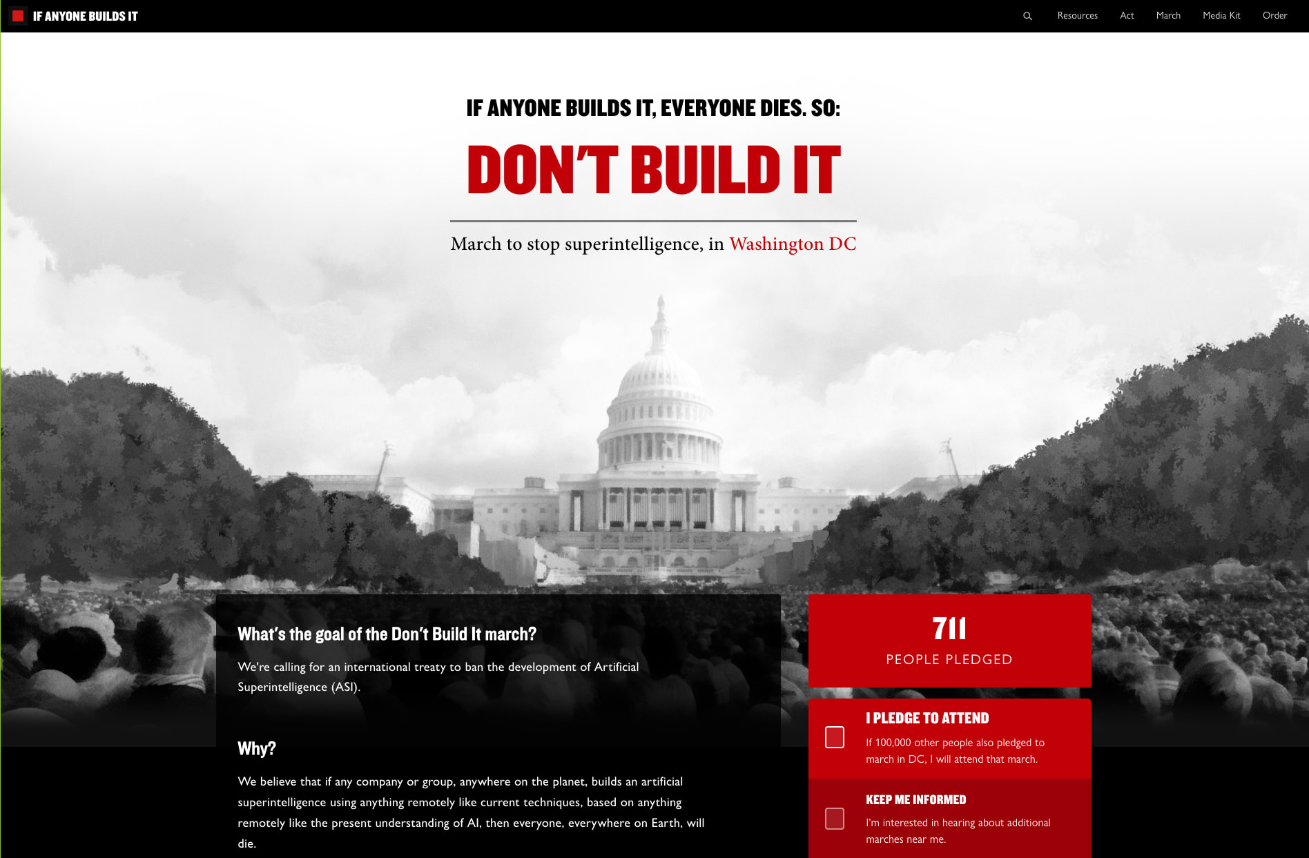 The If Anyone Builds It website includes a March page, wherein you can pledge to march in Washington DC, demanding an international treaty to stop AGI research if 100,000 people in total also pledge.
