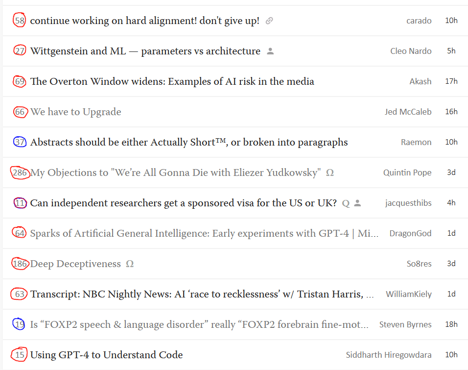 Half a year ago, we had the discussion about a lot of AI content. It since seems to have gotten more extreme; right now I count 10-3 of AI/xrisk - other stuff on the homepage (here coded as red and blue; I counted one post for both).