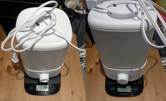 First I tested with just water, and I used distilled water because these humidifiers can turn the minerals in tap water into a fine dust it's better not to breathe. I filled the humidifier, weighed it, ran it for an hour on high, and weighed it again. I measured it losing 122g (2g/min), though this is likely an overestimate: instead of weighing the whole device before and after (like I did later) I weighed how much water I poured in (accurate) and then weighed what was left (inaccurate, due to not all the water coming out).