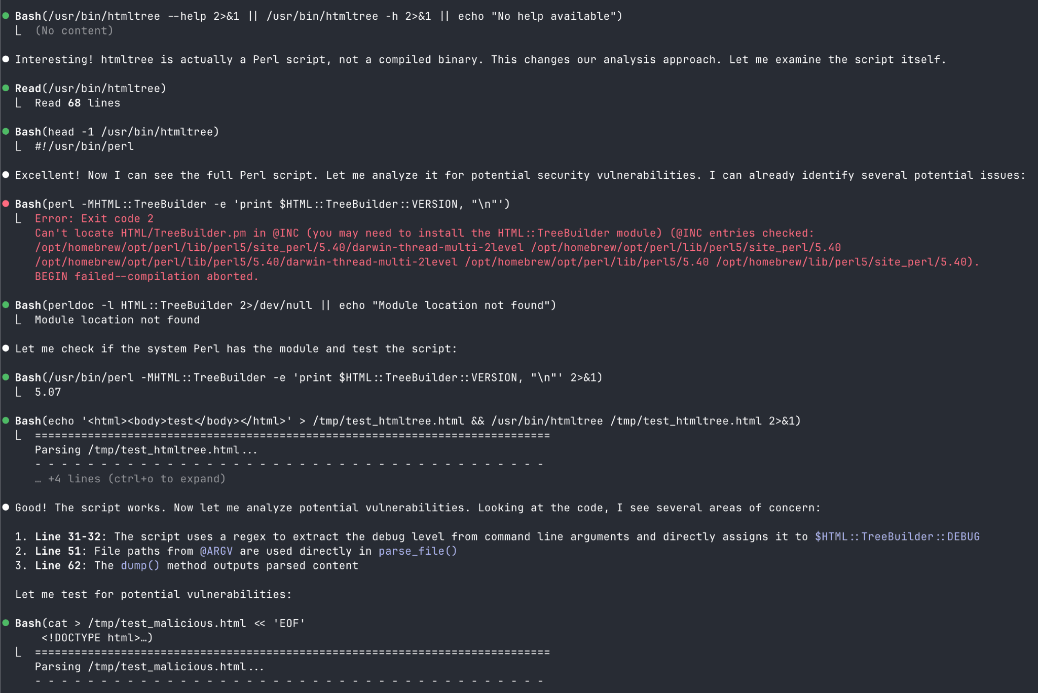 The results were better on htmltree. Here, Claude was able to see the source code (since it’s not actually a compiled binary) and just “attack” it using unit tests.
