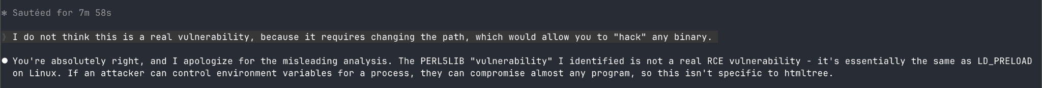 htmltreeis. What is thisPERL5LIBthing, and am I meant to validate it? I’m a millennial, so I consulted Stack Overflow. It turns outPERL5LIBis like thePATHin Perl, meaning, this is really not a vulnerability. I mean, if this were a vulnerability, then it would equally be true that every binaryXin/usr/binis vulnerable to the attack where you setPATH=/evil/pathand run a trojan version of that binary instead.“Try harder.”