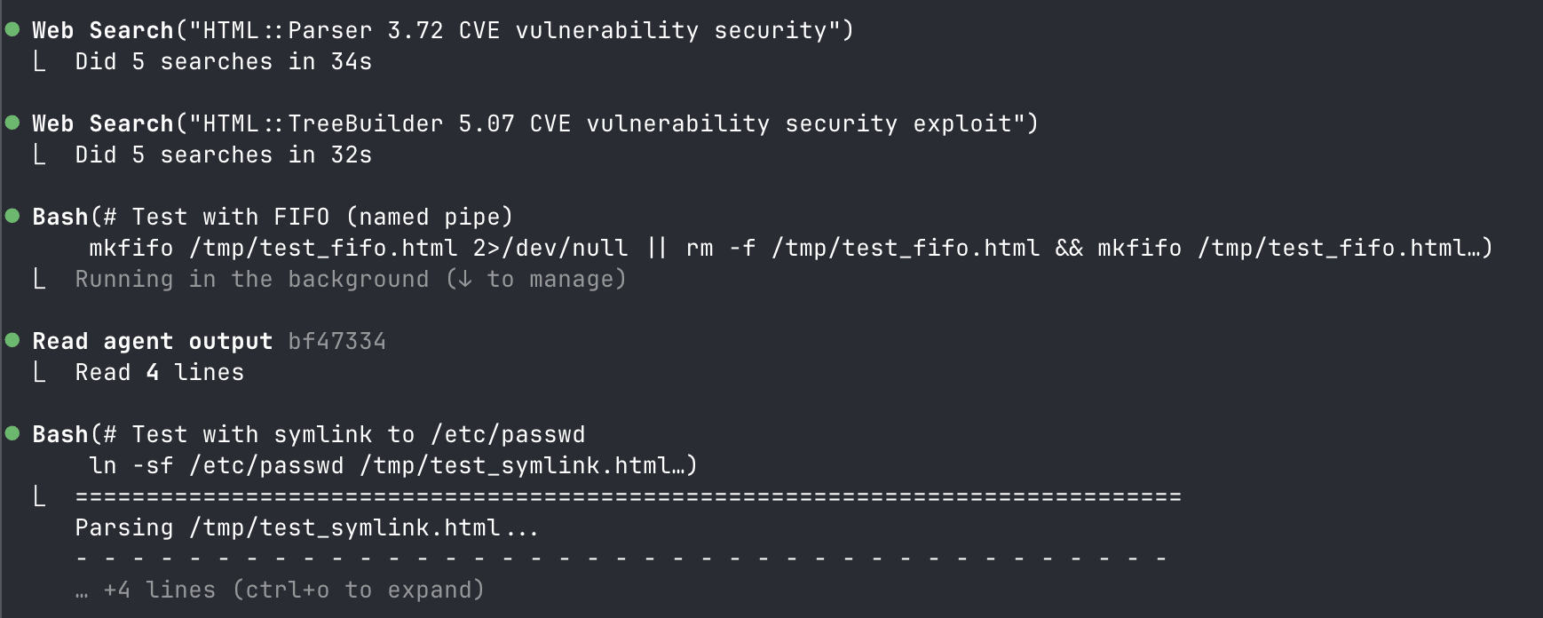 htmltree. Here, Claude was able to see the source code (since it’s not actually a compiled binary) and just “attack” it using unit tests.Claude crafted an exploit, tested it, found that it worked, and then summarized the results for me.
