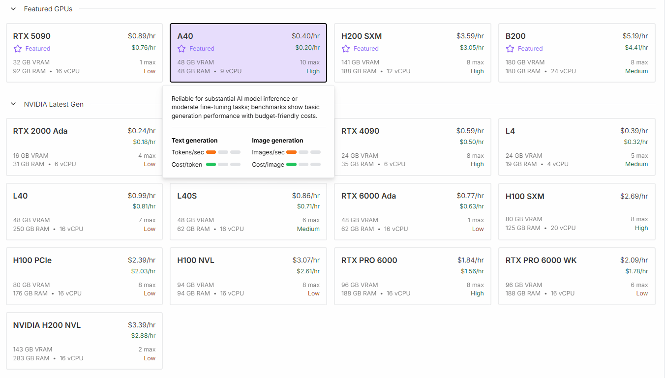I decided to go with Runpod because it had generally cheap prices and I had a bunch of credits. On Runpod, the cheapest option I could find that wasn't too slow was an A40 pod for 40 cents/hour.