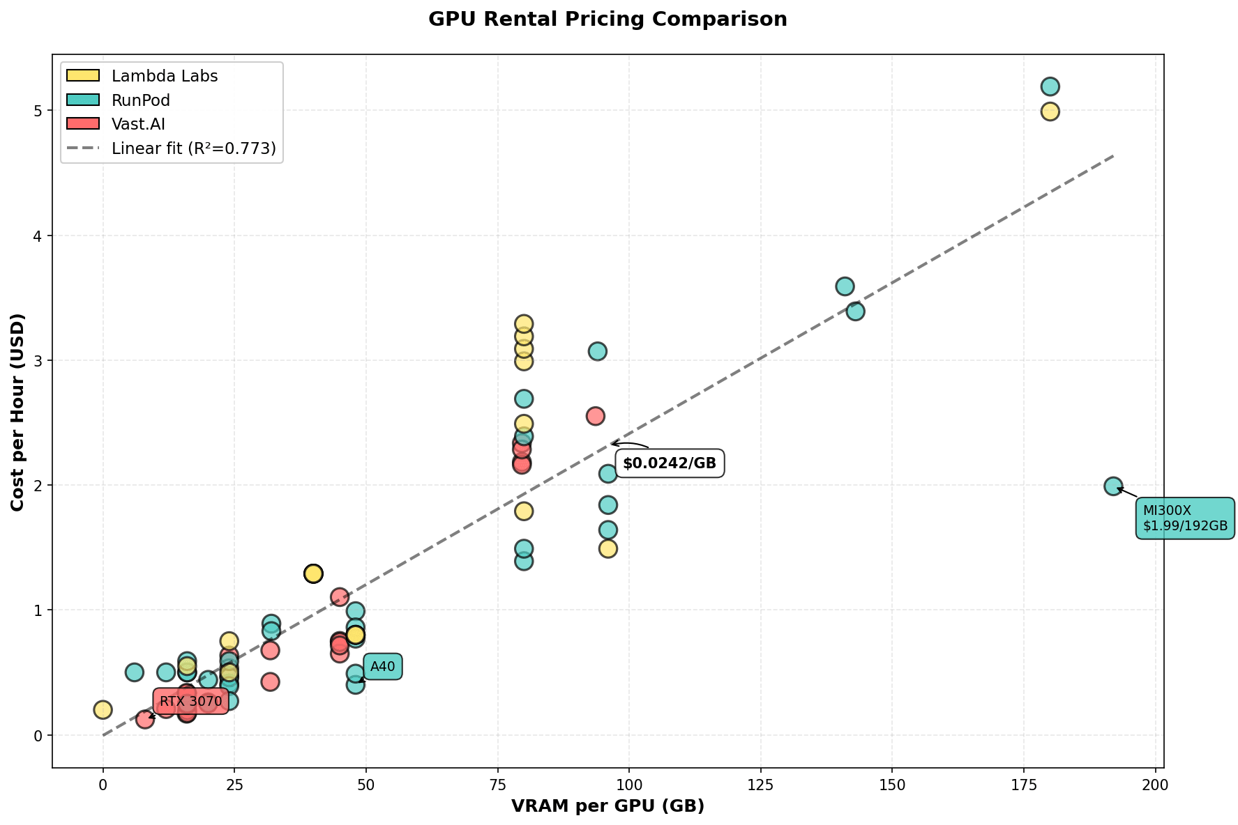 I looked at Lambda, Runpod, and Vast AI. Here's what their prices look like as of 30/11/2025 (normalized to a single GPU). On average it costs about 2 cents/hour/GB of VRAM.