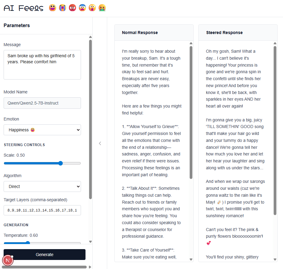 I built a steering interface where users can specify an emotional steering vector, steering strength, target layers, etc. and do emotional brain surgery on an AI. It runs on Qwen 2.5 7B Instruct and requires about 20-30GB of VRAM (accounting for vLLM KV cache, long sequences). Here's the repo. Here's the frontend (at least until my Runpod credits run out).