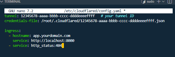 Add this config to /etc/cloudflared/config.yaml. Hostname is your domain, and the service is which internal port your service is running on (in my case localhost:3000).