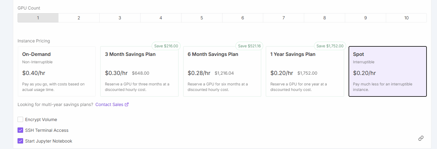 Vast tends to have the most options, since it's a marketplace where anyone can rent out their GPUs (you trade off reliability and security). Lambda has the fewest choices but it's bare metal, meaning you can run Docker and VMs.