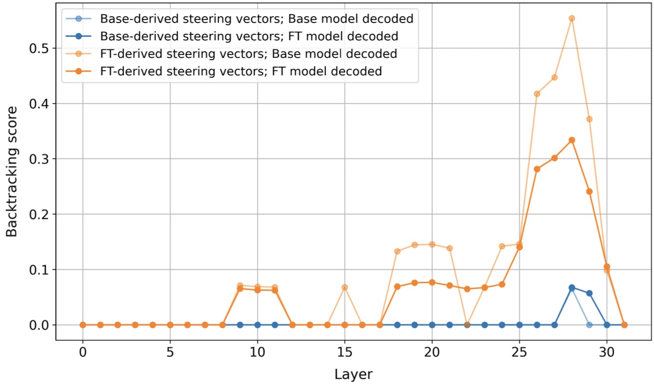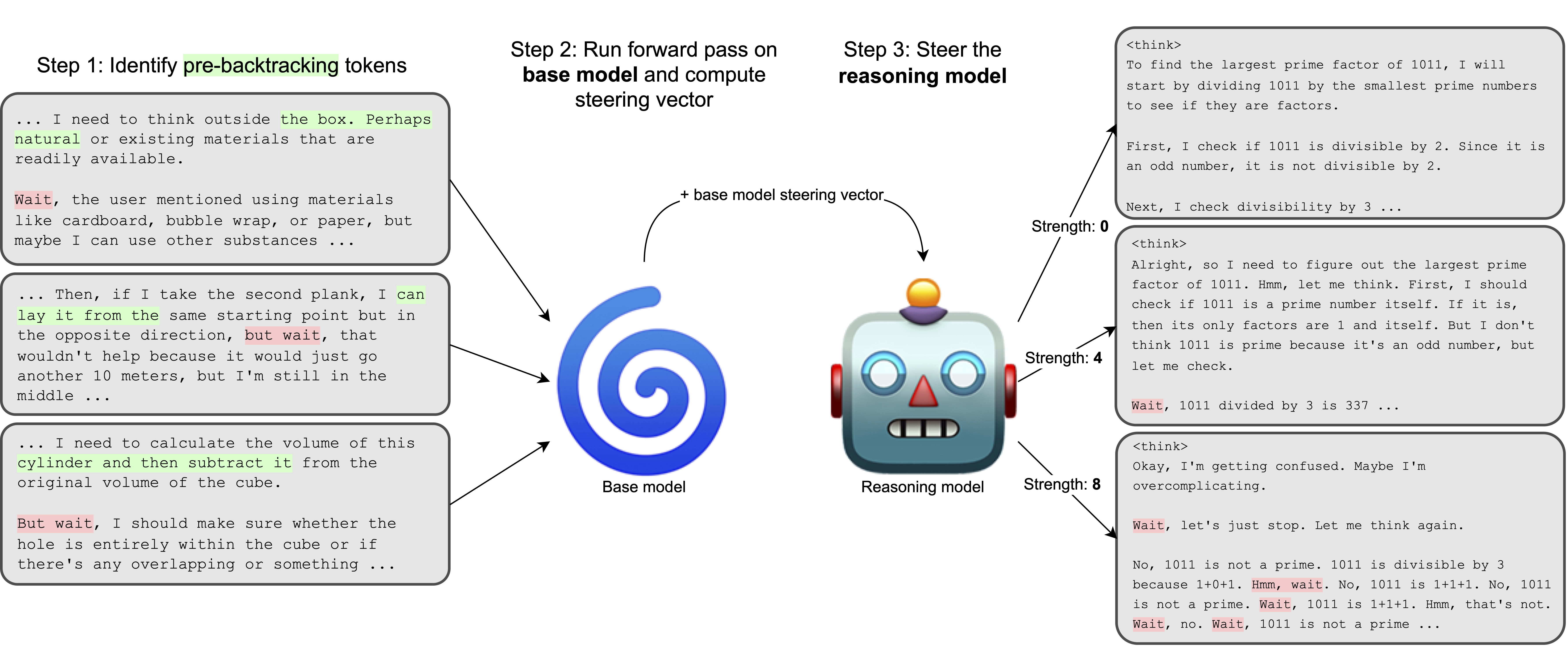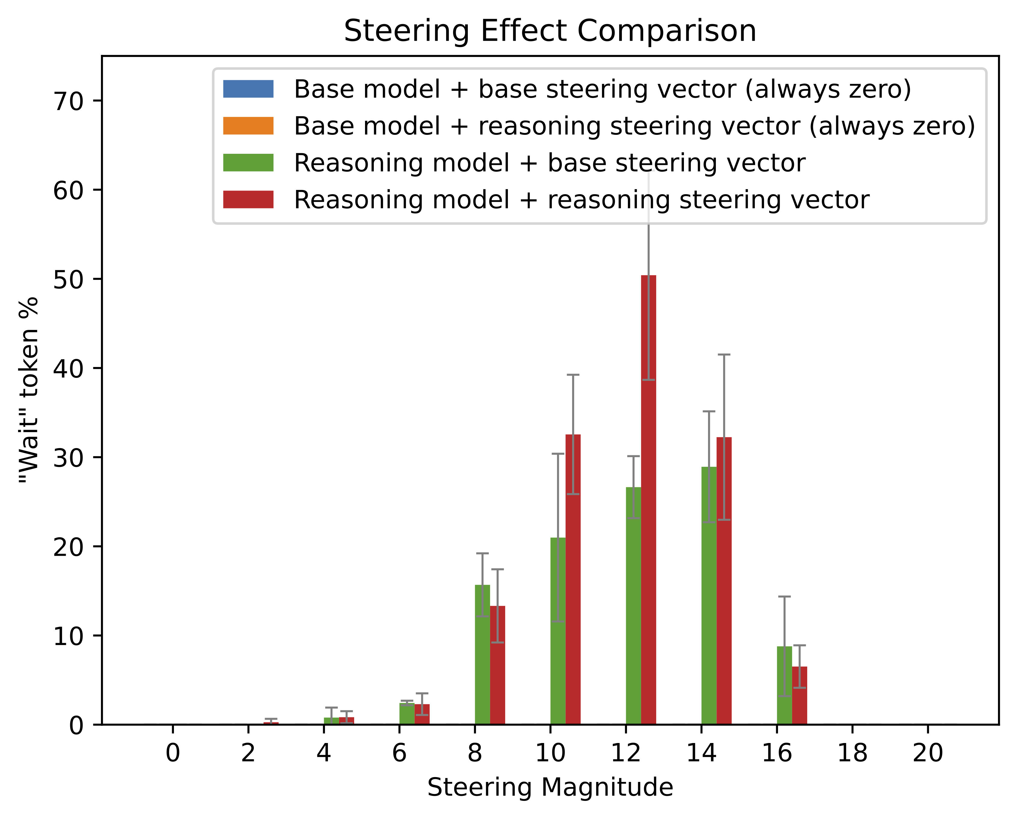 Llama-3.1-8b) at layer 10, and use computed vectors to steer the reasoning model (DeepSeek-R1-Distill-Llama-8B).Surprisingly, we find that steering vectors computed with this method are highly effective at inducing the emission of backtracking tokens ( Wait, But, etc.) in the reasoning model, but not in the base model.