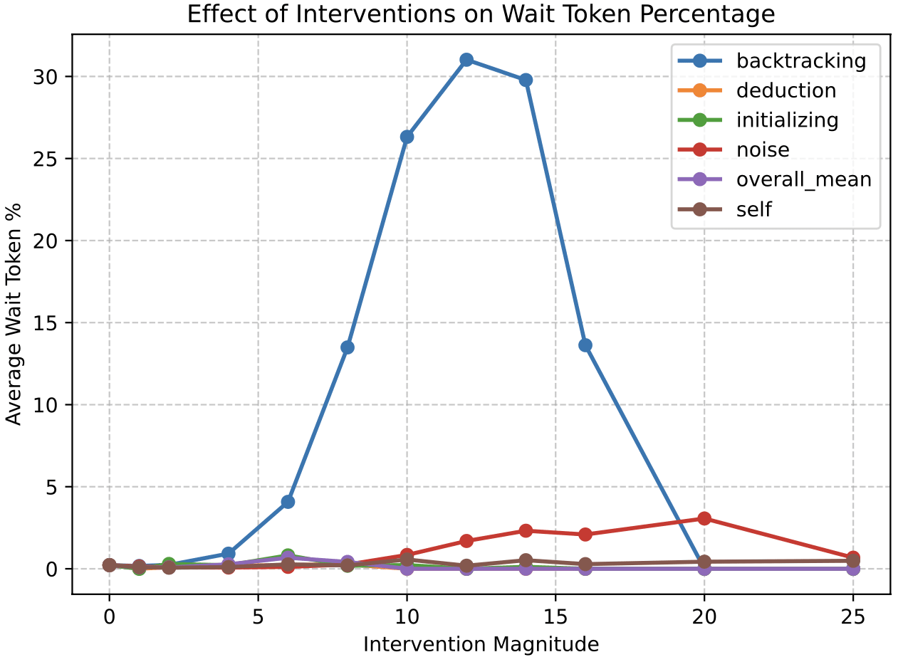 We compare our results to various baselines, and find that our backtracking steering vector has a substantially greater effect on the emission of the Wait token compared to other methods. We try steering with mean activations, adding random noise, increasing the magnitude of activations, and steering vectors computed based on other reasoning behaviors like deduction or initialization (problem restatement). Notably, we do find that adding random noise to activations does induce backtracking token emission slightly, but this effect is small compared to the effect of our backtracking steering vector.
