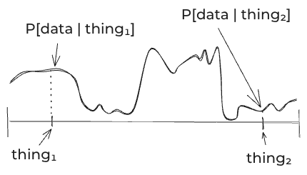 After you’ve done that, you can look at the data. For each thing that could be true, you need to think about the probability of the data. Since there’s an infinite number of things that could be true, that’s an infinite number of probabilities you need to specify. You could picture it as some curve like this: